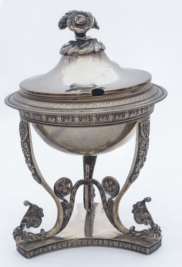 in arg.800 finemente cesellato. Peso 600 gr. Assente il cucchiaio da servizio.
