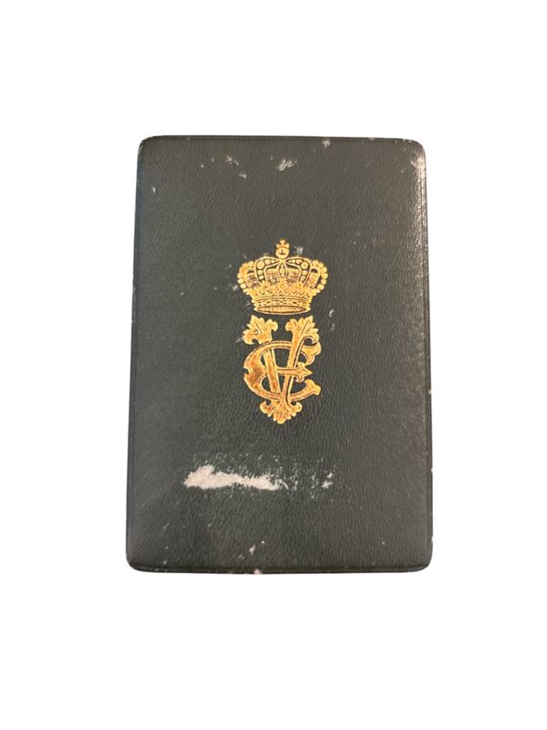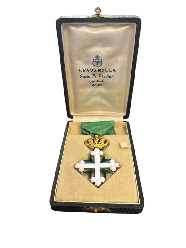In oro e smalti, con nastro originale. In confezione.