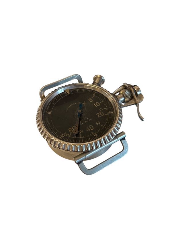 Cronografo "a ritorno" contasecondi per operatori sganciabombe. Quadrante firmato, con numeri arabi. Movimento a carica remontoir. Difetti, mancante del vetro.