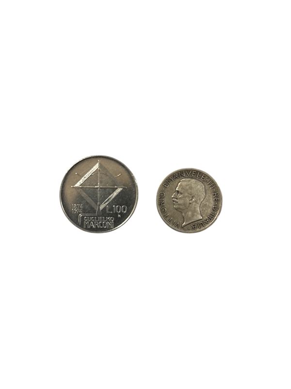 100 lire commemorative per il centenario di Guglielmo Marconi; 5 lire del 1927.