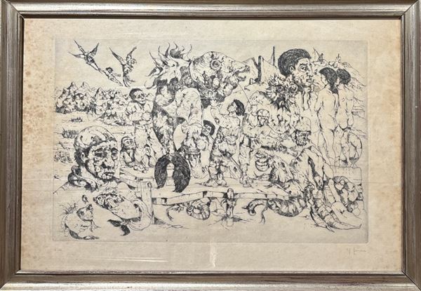 Enzo Frascione, "Allegoria", litografia, 40 x 60 cm, es. n. 1740, firmata. In cornice.