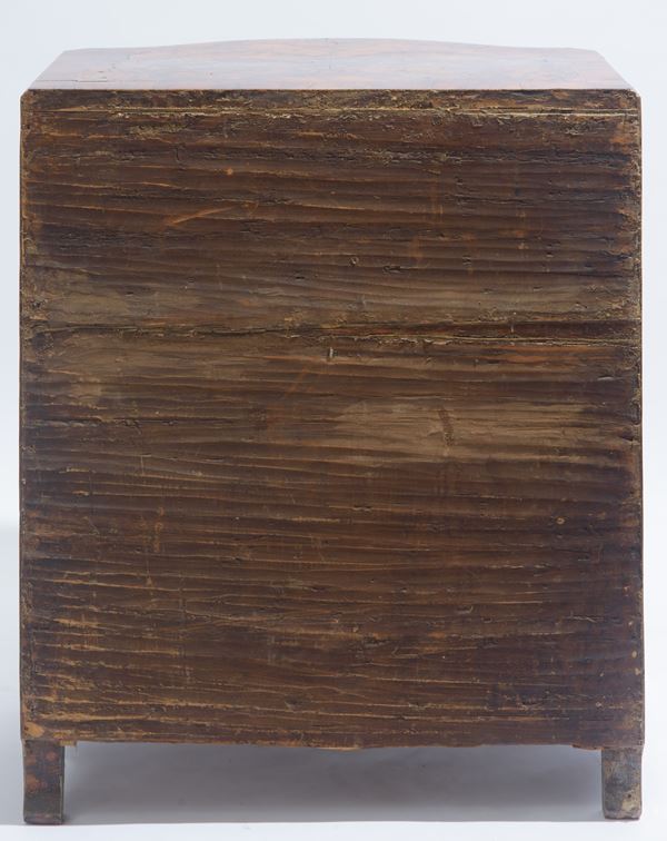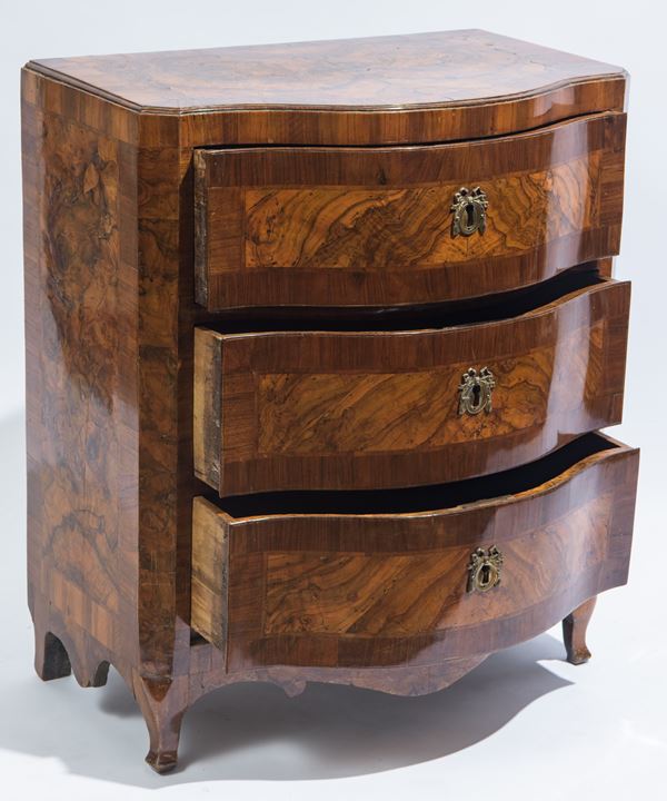 a tre cassetti con traversa. In legno di noce e radica di noce
