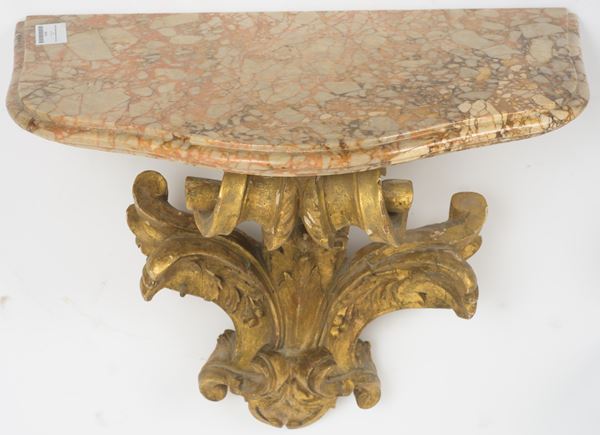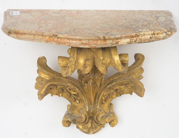 Composte da elementi in legno dorato e scolpito a volute con piano in marmo sagomato in breccia di Aleppo.
