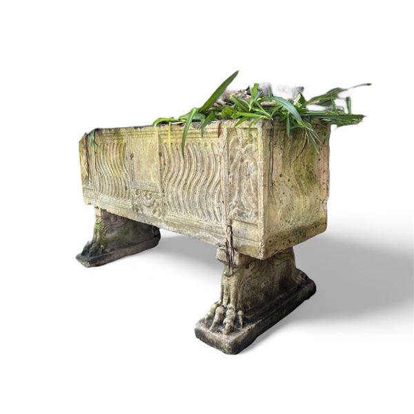 in graniglia, di forma rettangolare, poggiante su piedini a forma di zampa leonina. A imitazione di un sarcofago romano strigilato. Il lotto si vende da svuotare e ritirare a cura e carico dell'acquirente. Il lotto si trova a Roma.