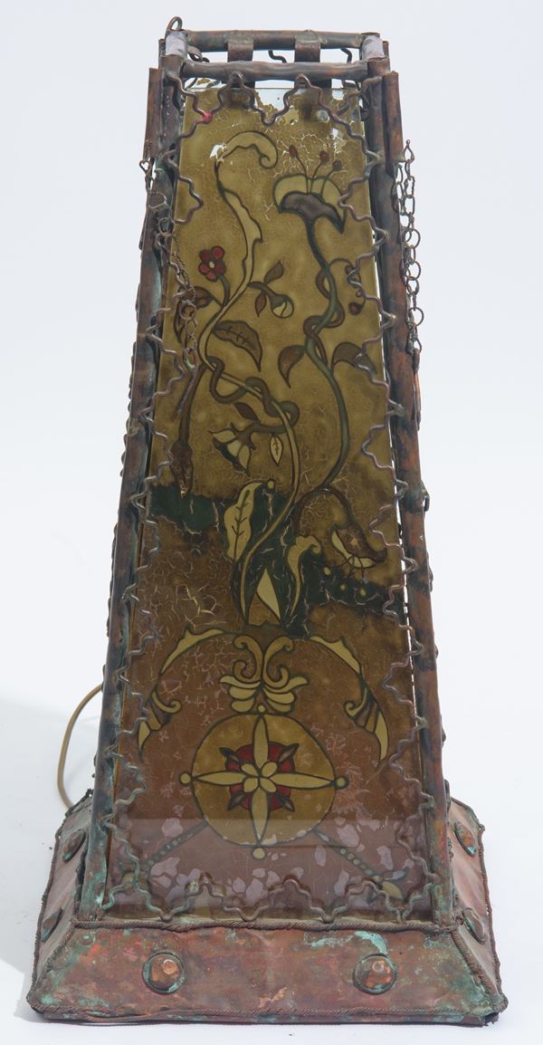 in rame con basamento quadrato e restremato, inserti in vetro decorato a motivi floreali