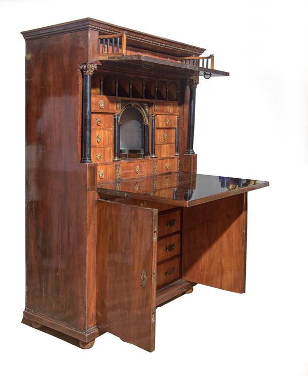 In noce e radica di noce, parti intagliate in legno ebanizzato e in legno dorato. Calatoia con cassettiera e castello interno e pirografia interna. Cassetto superiore con calatoia e cassettiera interna. Due ante inferiori con quattro cassetti.