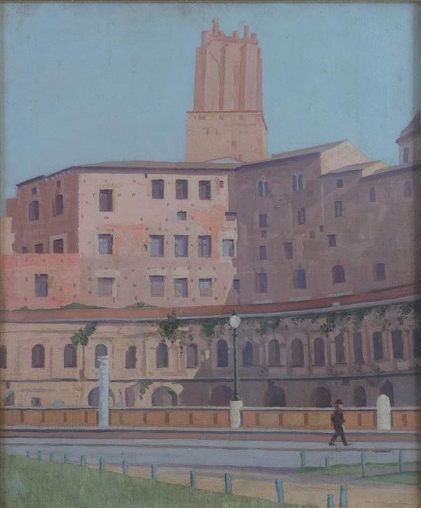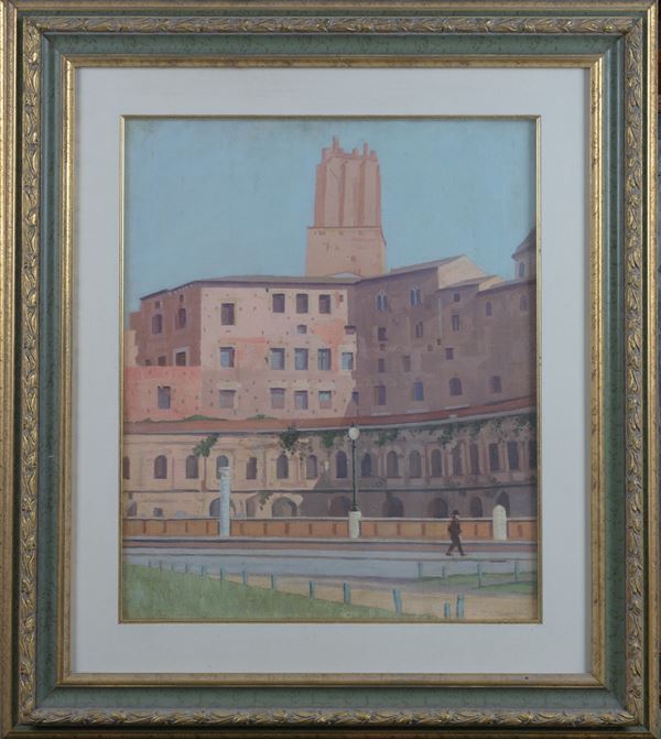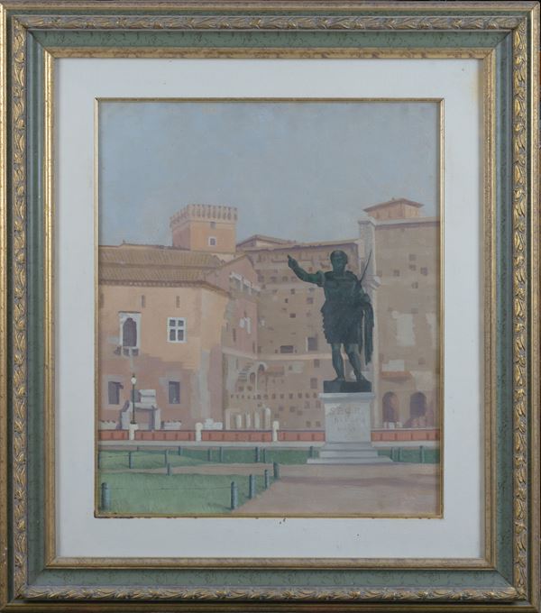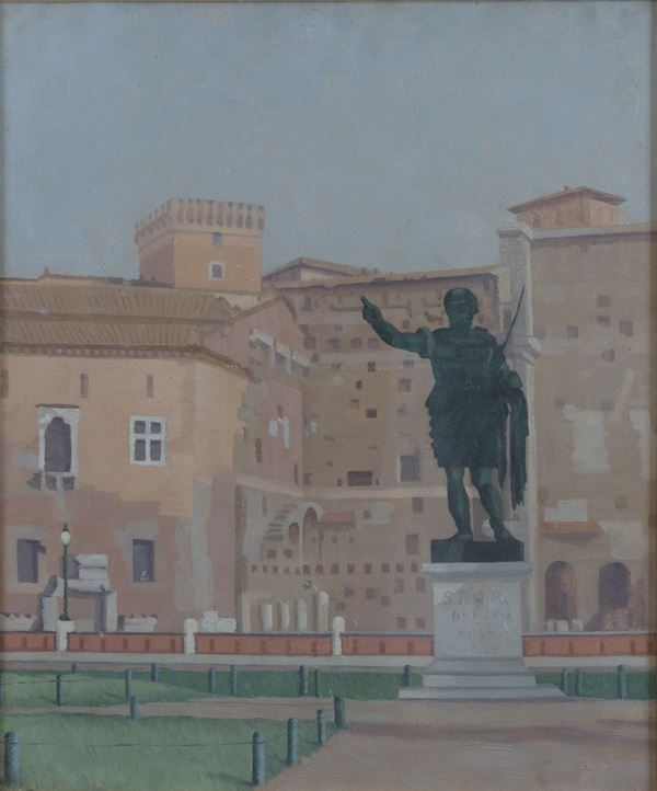 Veduta dei mercati di Traiano e scorcio dei Fori Imperiali con la scultura di Cesare Ottaviano, Artista attivo nella seconda metà del XIX secolo