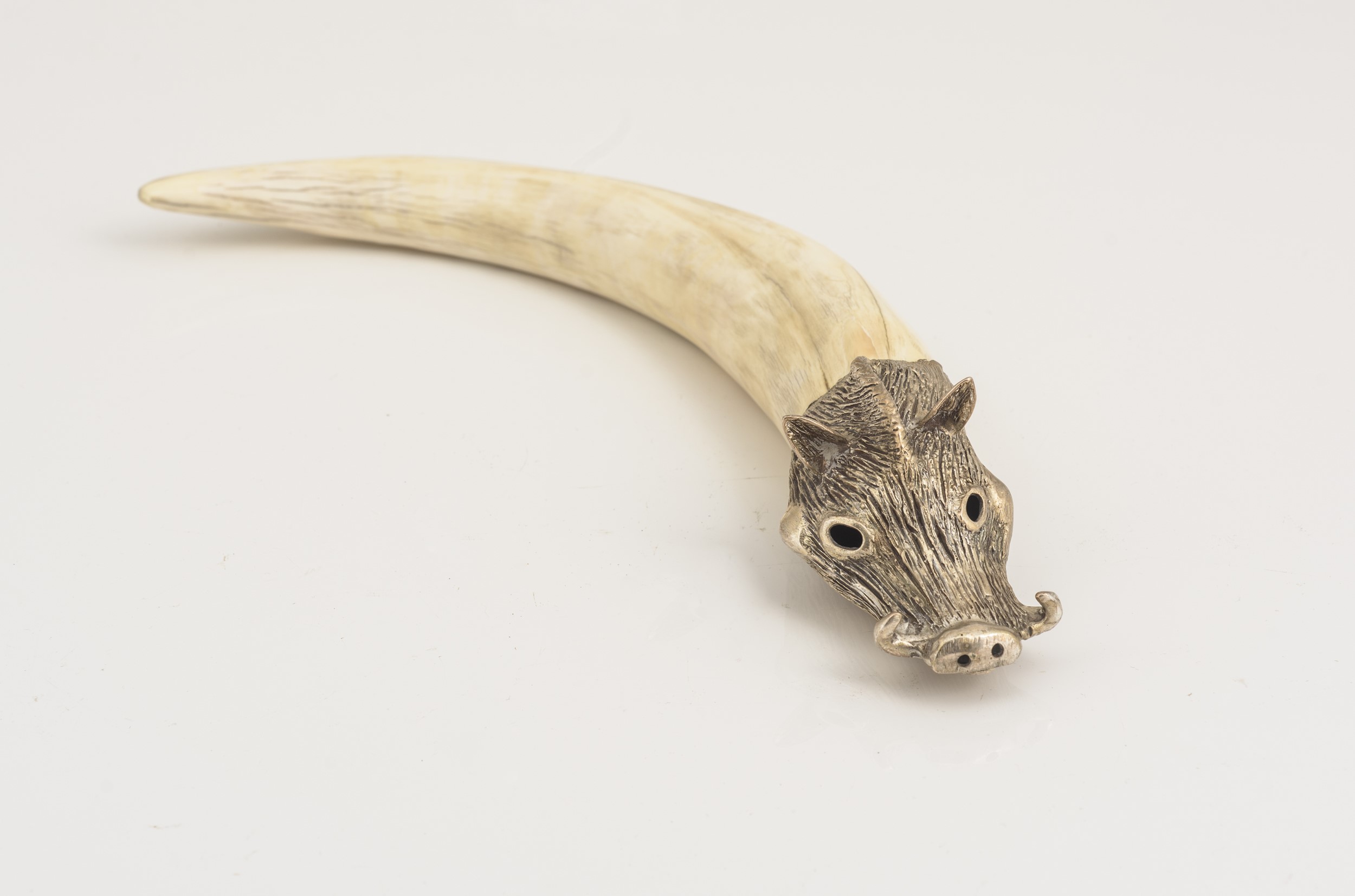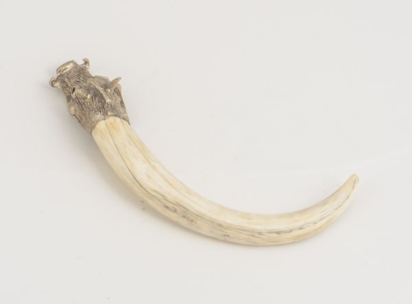 In metallo argentato e osso. Testa a forma di cinghiale