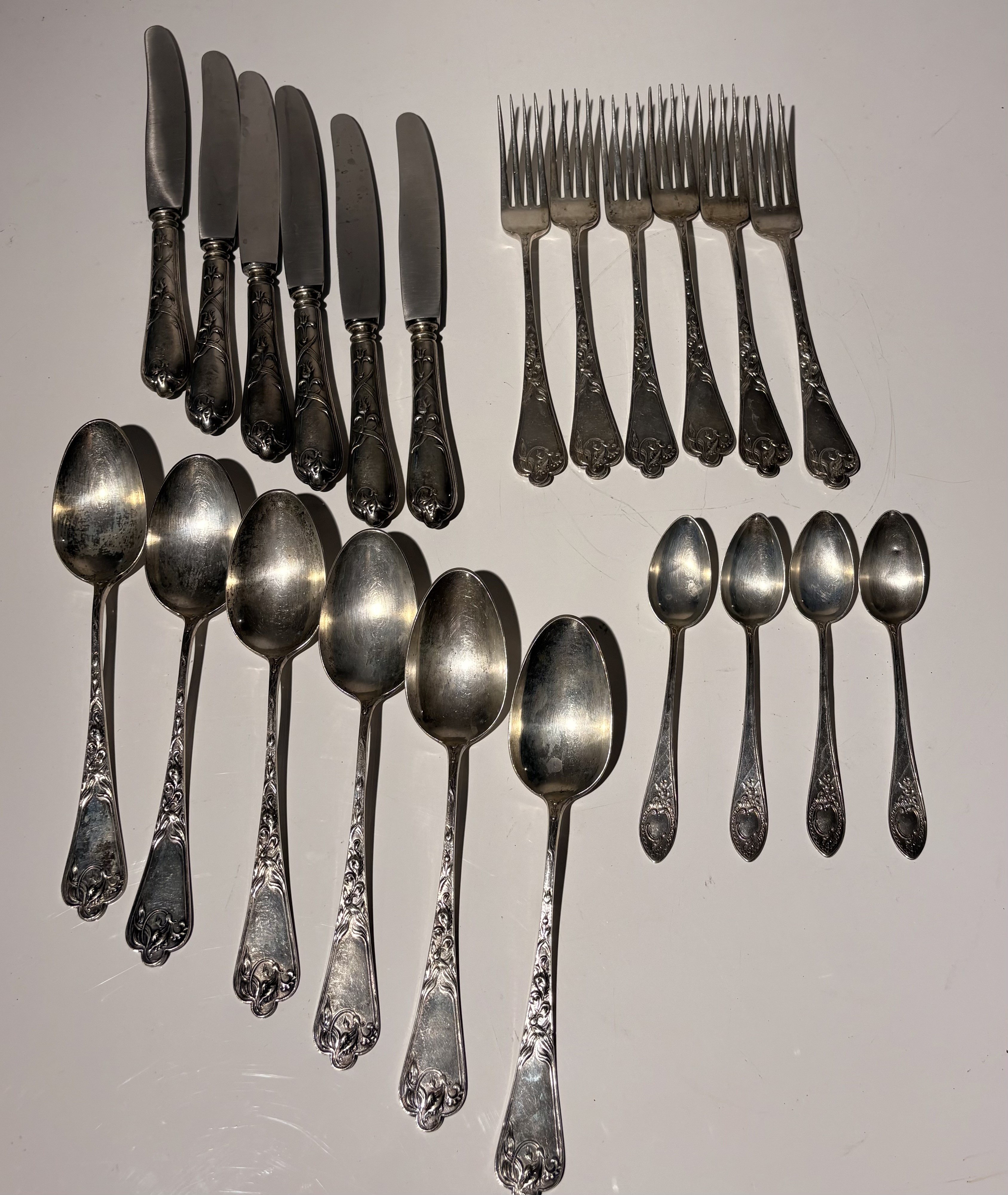 composto da: 6 forchette; 6 cucchiai; 6 coltelli; 4 cucchiaini. Peso 895 gr.