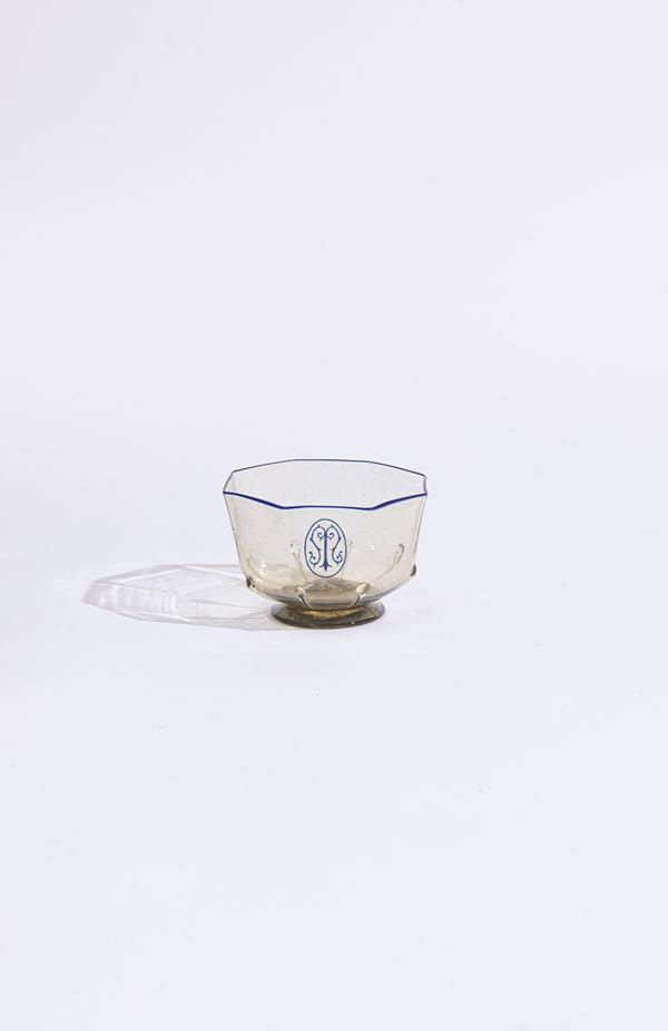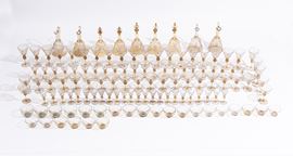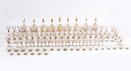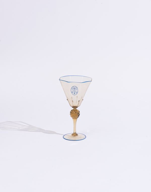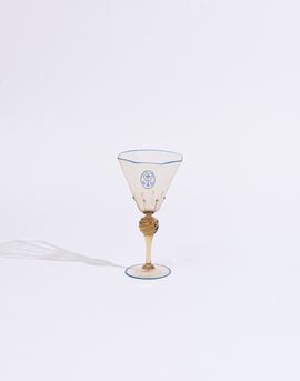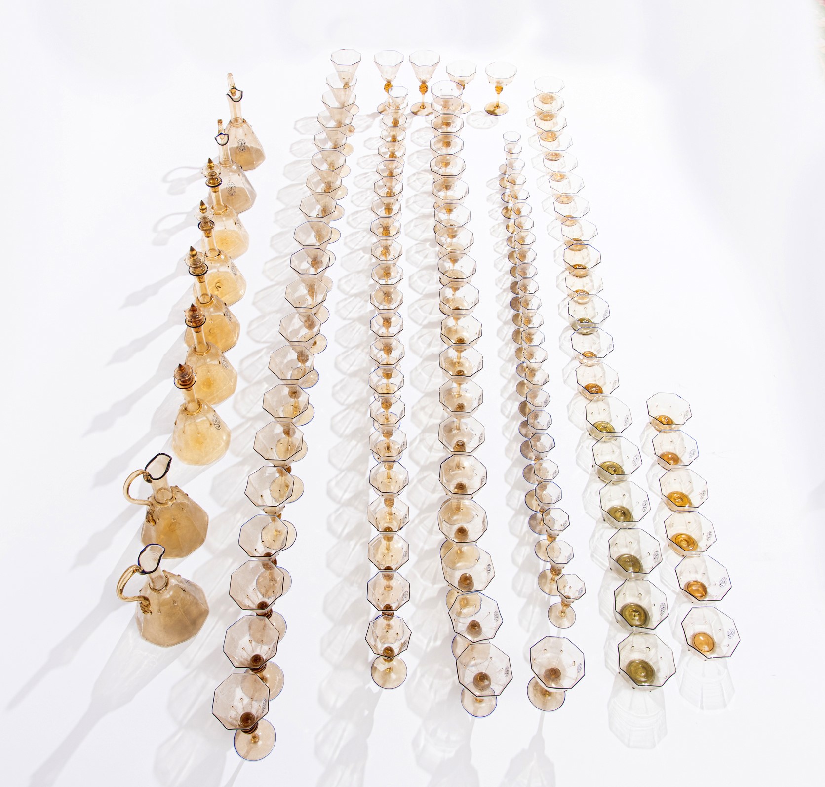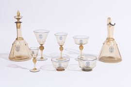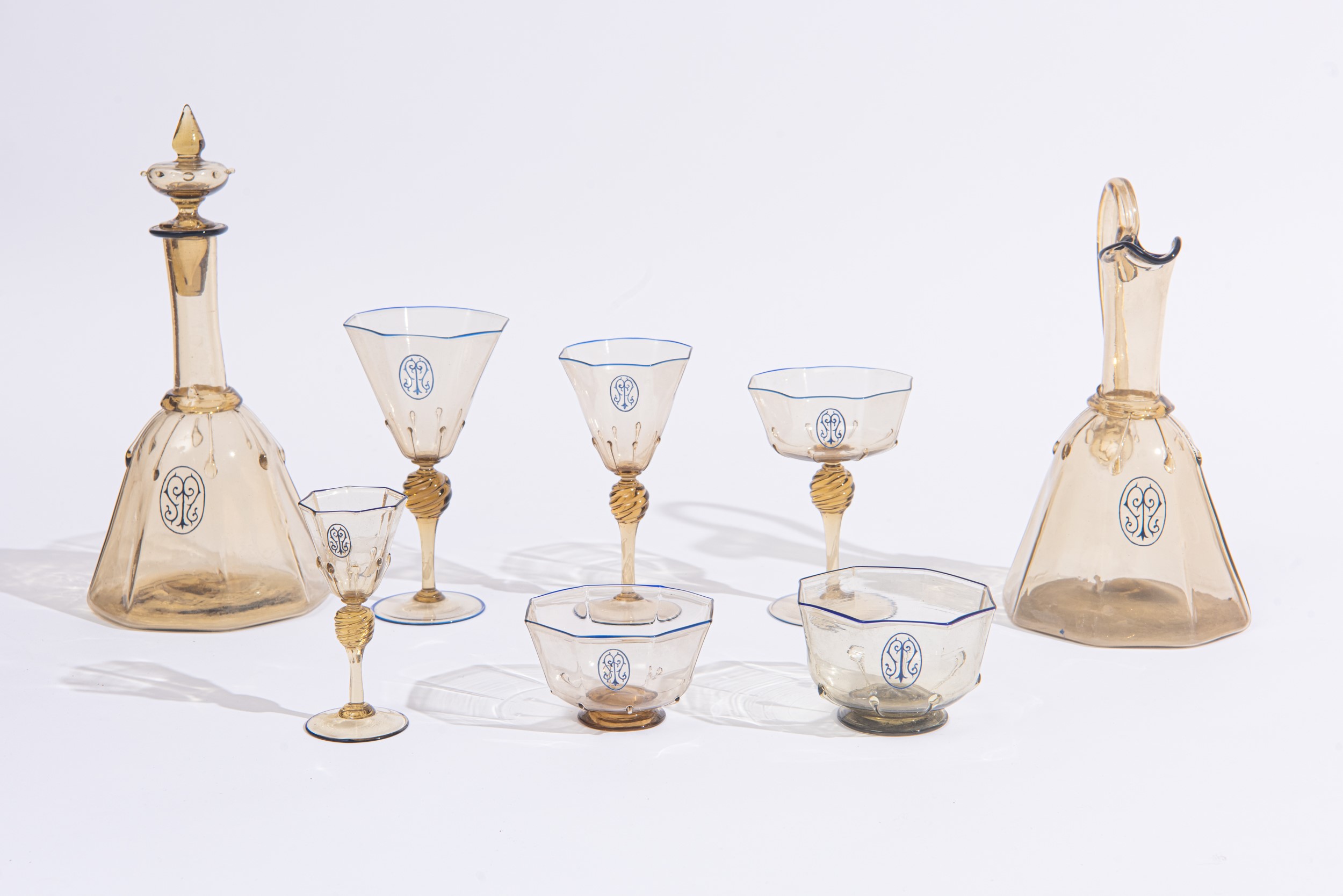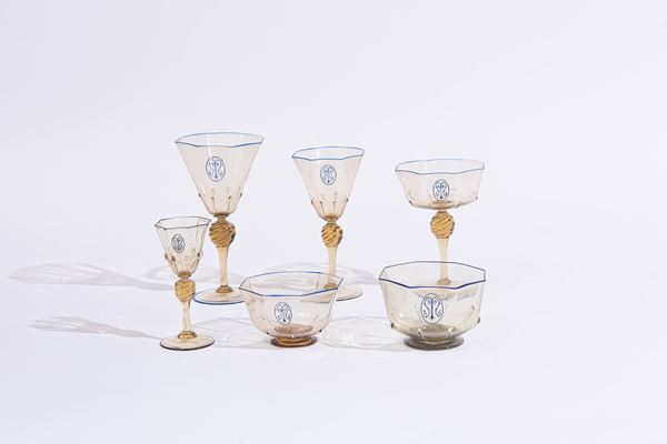 Il servizio conta in totale 124 pezzi ed è così composto: 4 versatoi (H. 27 cm), 5 caraffe (H. 30 cm); 22 calici per l'acqua (H. 18 cm); 21 calici per il vino (H. 16,5 cm); 22 coppe per lo champagne (H. 13 cm); 25 calici per il liquore (H. 12 cm); 25 coppe macedonia (H. 5 x D. 9 cm). Di forma ottagonale, con bordo blu e monogramma della famiglia.