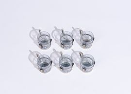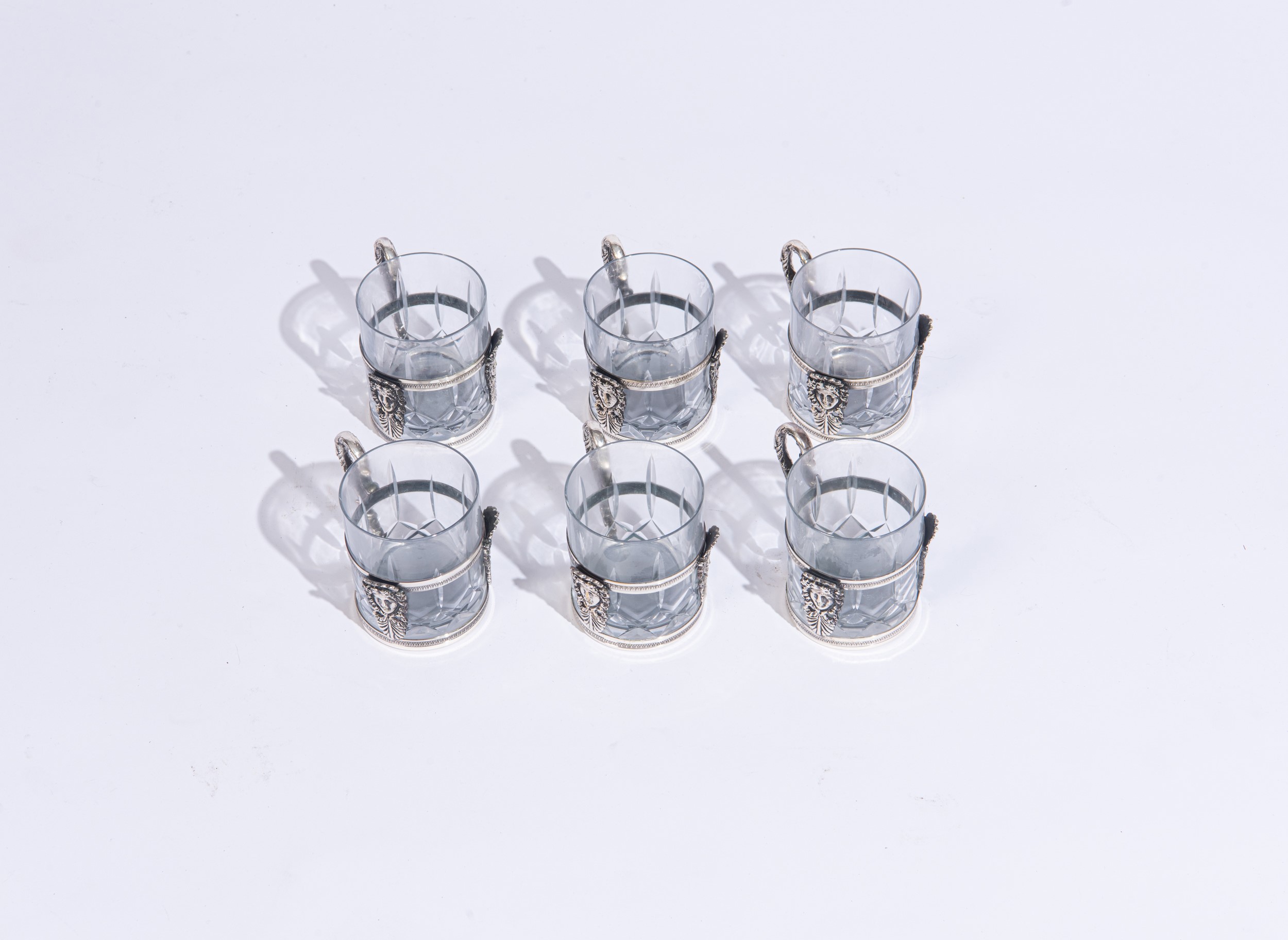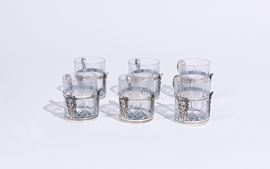 Sei bicchieri in vetro con incamiciatura in metallo argentato