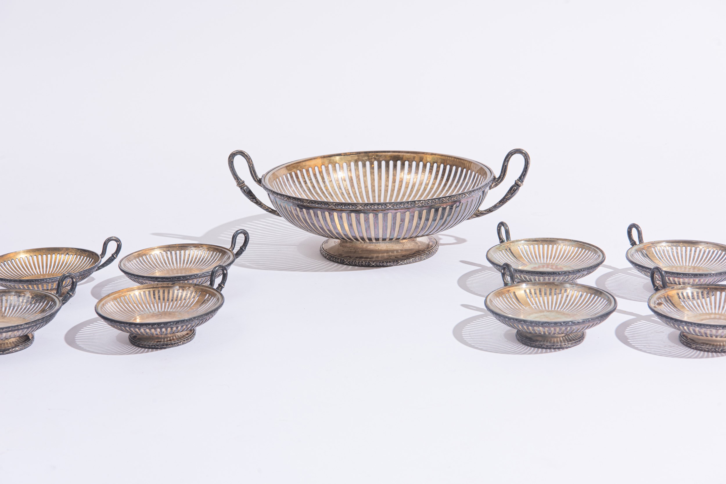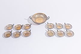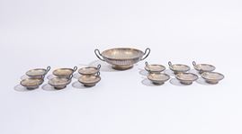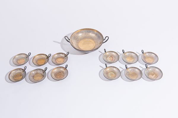 in metallo argentato e dorato; decorato con traforo a raggiera; composto da una coppa grande con due manici e dodici coppette piccole con un manico.