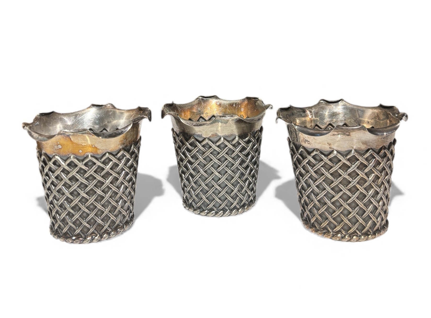 Tre Cestini porta bottiglie in metallo argentato, Inghilterra, Inizio XX secolo