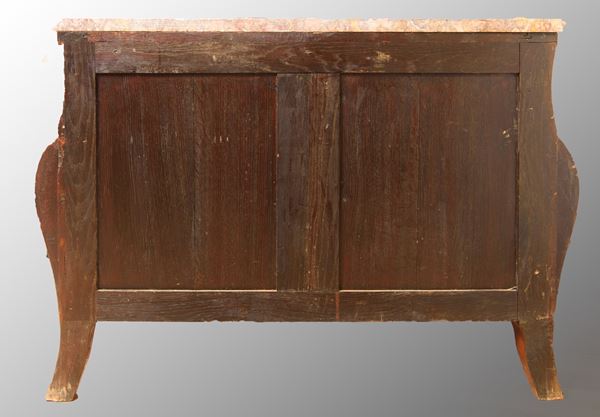 Di linea Reggenza, a quattro cassetti con traversa, in legno di rosa, applicazioni in bronzo dorato, piano superiore in marmo giallo di Verona.