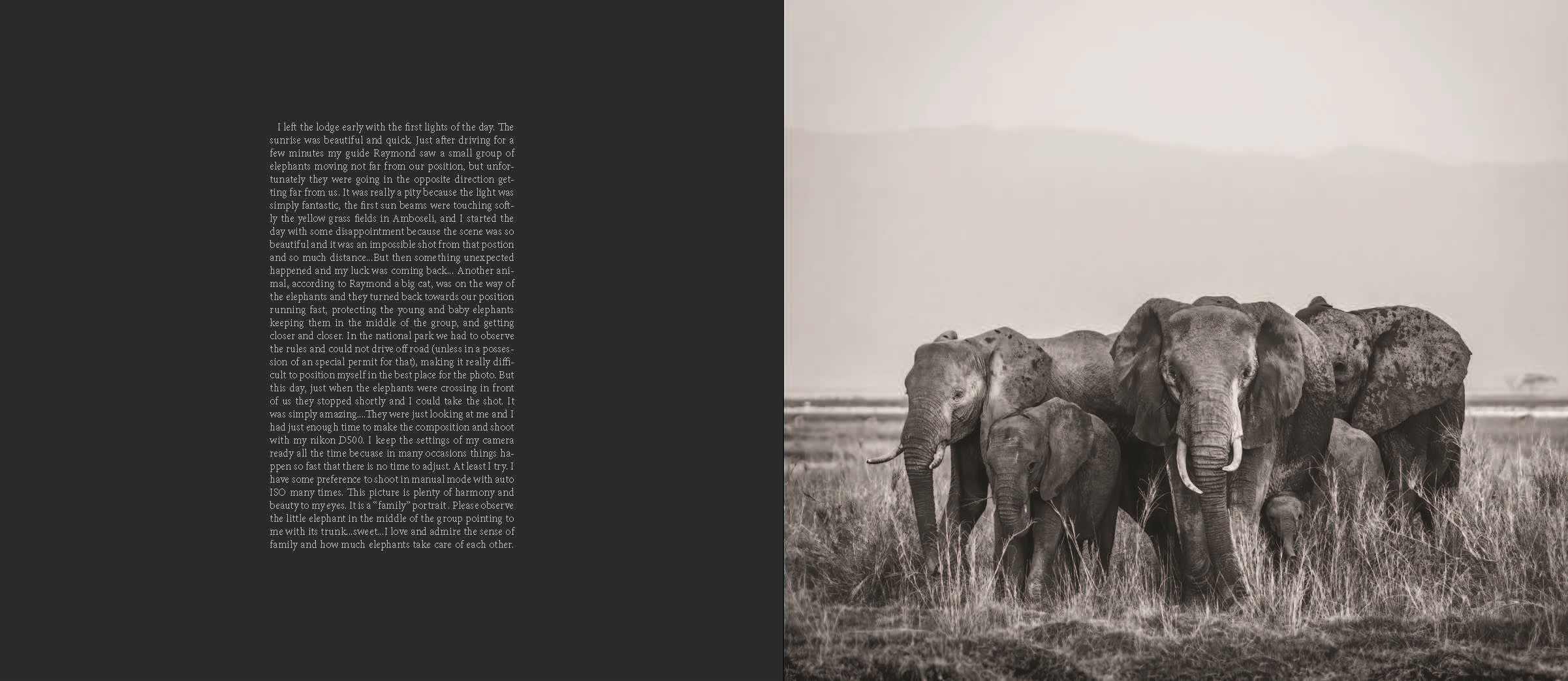 A photographic book based on three years of fieldwork on Kenya's wildlife, focusing on the elephants of Amboseli. High-quality printing to raise awareness and support wildlife and the Maasai community.