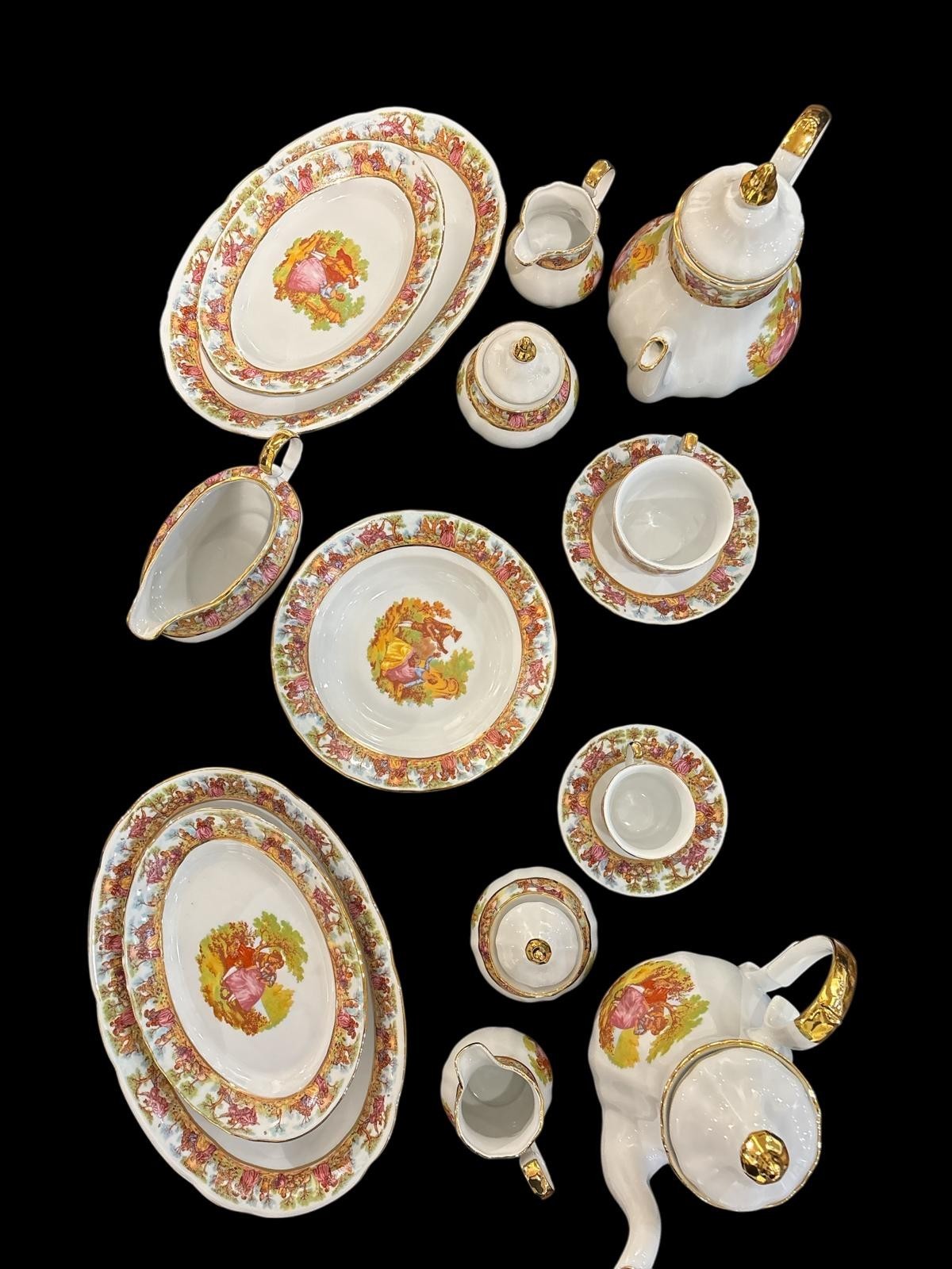 Composto da: 1 caffettiera, 1 zuccheriera, 1 lattiera, 11 tazzine da caffè e 10 piattini; 1 teiera, 1 zuccheriera, 1 lattiera, 12 tazze da thè e 12 piattini; 2 vassoi ovali (lunghezza 23,5 cm), 2 vassoi ovali (lunghezza 31,5 cm), 12 piatti da dessert, 12 piatti fondi.