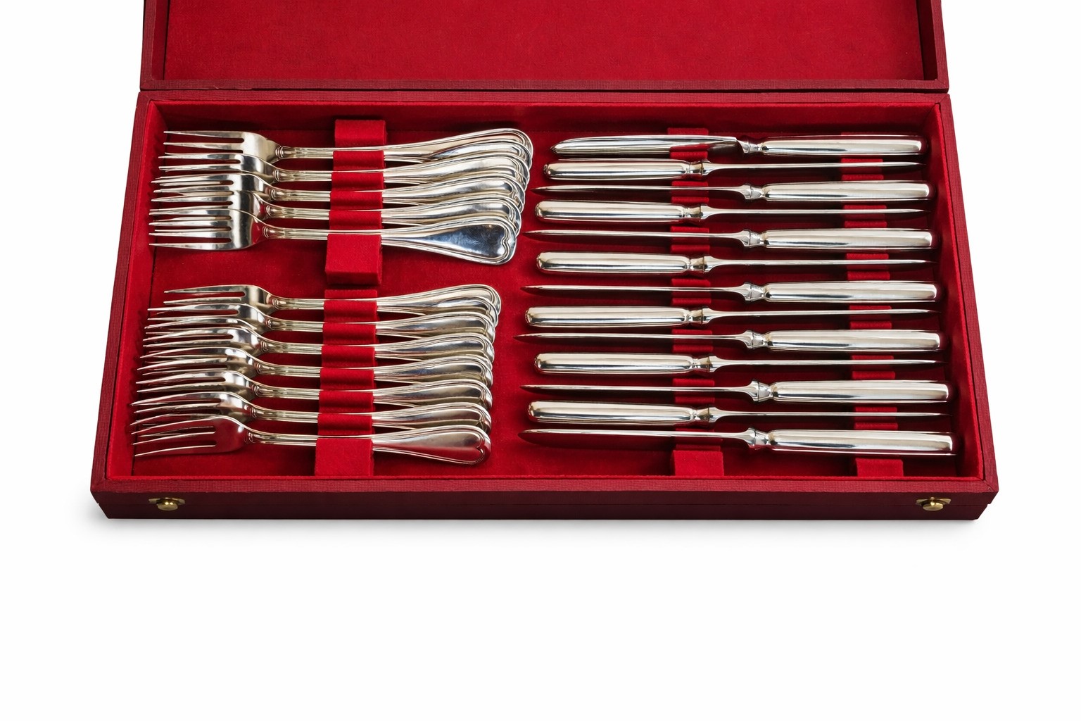Composto da: 12 cucchiai, 12 cucchiai da dolce, 12 cucchiaini da caffè, 12 coltelli, 12 coltelli da dolce, 24 forchette, 12 forchettine da frutta, 12 forchettine da antipasto, 1 mestolo, 2 grandi cucchiai, 2 grandi forchette.