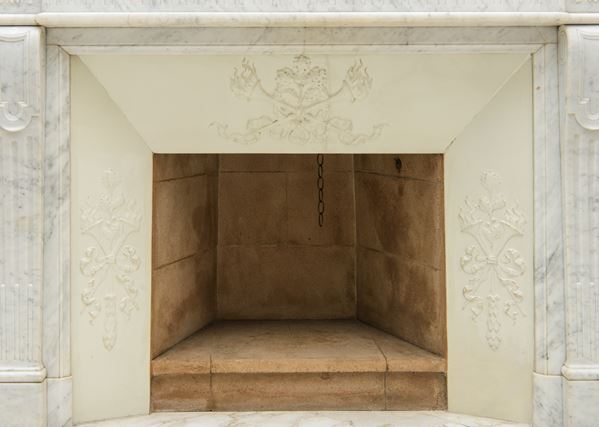 Camino in marmo bianco venato, con struttura architettonica di gusto neoclassico.