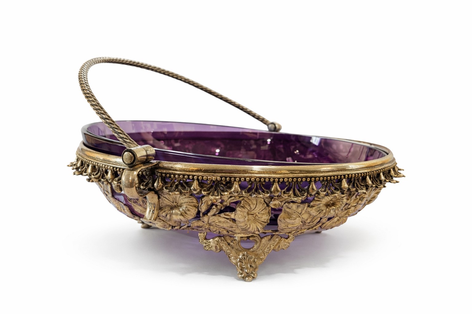 in metallo argentato, con manico e decorazione a motivi vegetali. Opalina magenta.