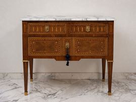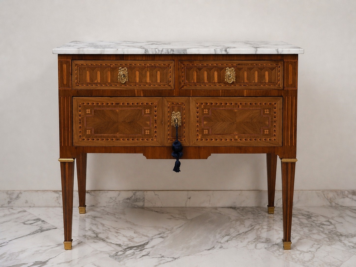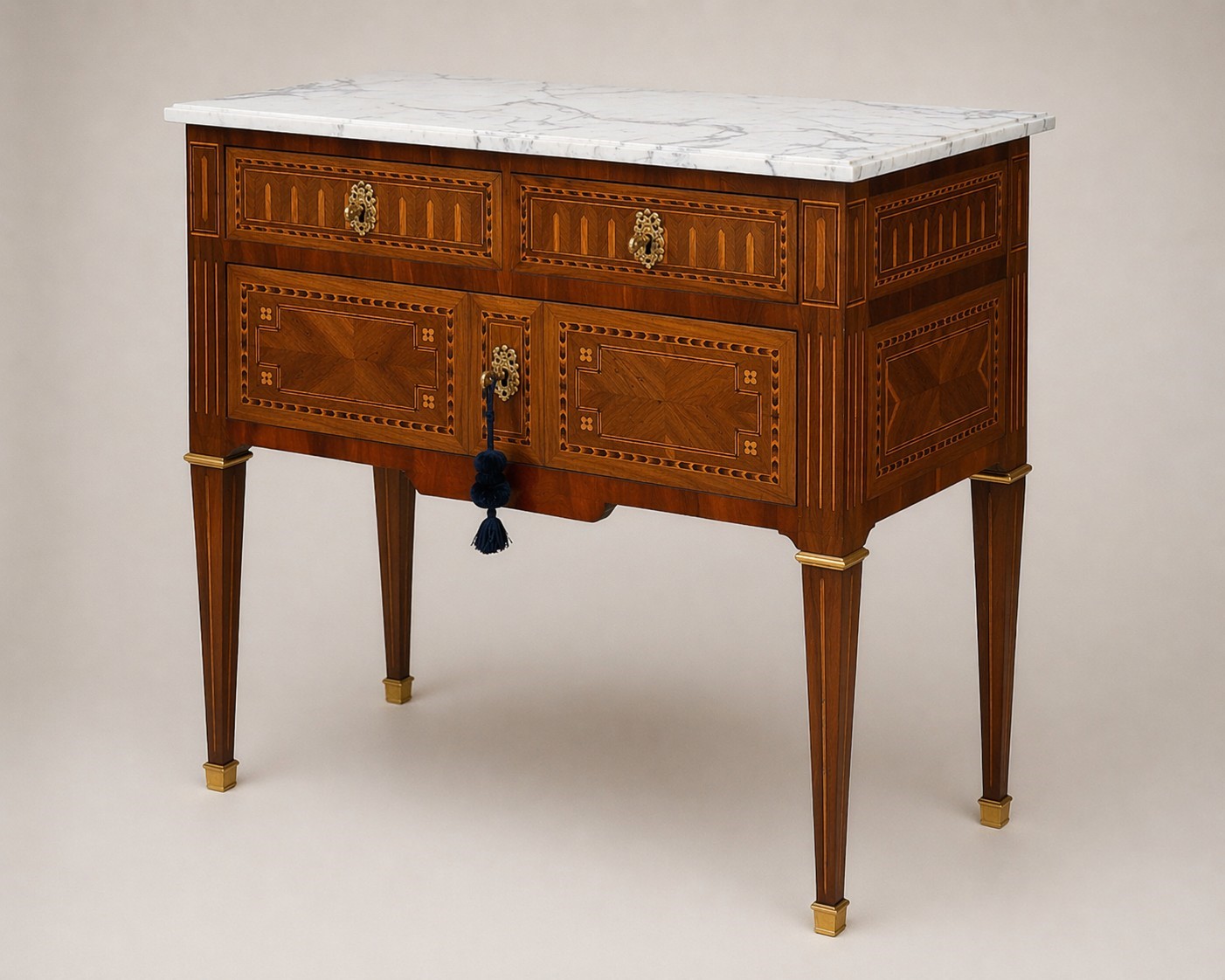Il fronte è caratterizzato da due cassetti superiori affiancati e un cassetto inferiore, decorati con raffinati motivi geometrici e riserve centrali a riquadri, realizzati mediante intarsio di diverse essenze lignee. Le gambe tronco-piramidali, rastremate verso il basso, sono impreziosite da filettature e terminano con sabot in bronzo dorato e cesellato.