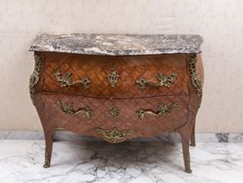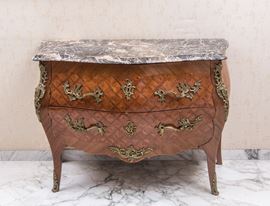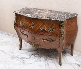 La superficie è impreziosita da una minuta marqueterie a disegno geometrico, mentre i cassetti sono ornati da maniglie e bocchette in bronzo dorato finemente sagomato, con motivi rocaille. Ulteriori applicazioni in bronzo decorano gli spigoli e i montanti.