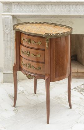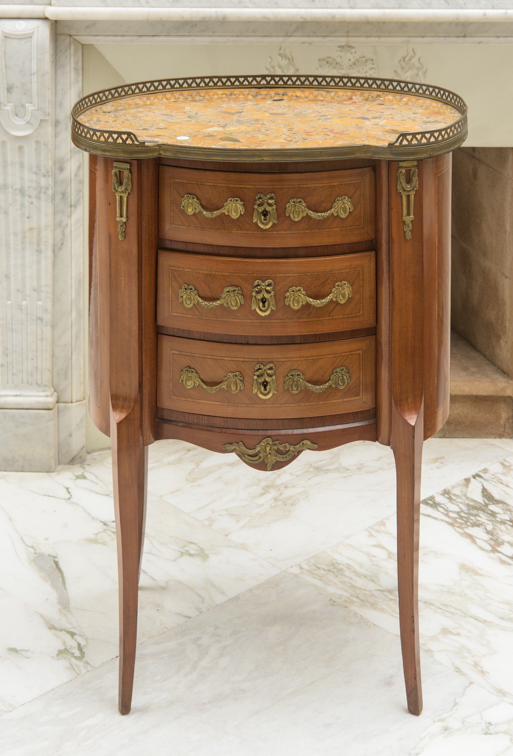 Comodino in stile Luigi XVI. Realizzato in legno di noce e bois de rose con impiallacciatura in essenze pregiate disposte a spina di pesce sui fianchi e con pannelli filettati sul fronte. Il mobile presenta struttura leggermente bombata con tre cassetti sul fronte, ciascuno dotato di maniglie e bocchette in bronzo dorato finemente lavorate, e grembiule sagomato con applicazione ornamentale centrale. Il piano è in marmo policromo incassato, circondato da una galleria in bronzo traforato che conferisce eleganza e funzione contenitiva. Le gambe sono sottili, rastremate e leggermente mosse, coerenti con il gusto neoclassico.
