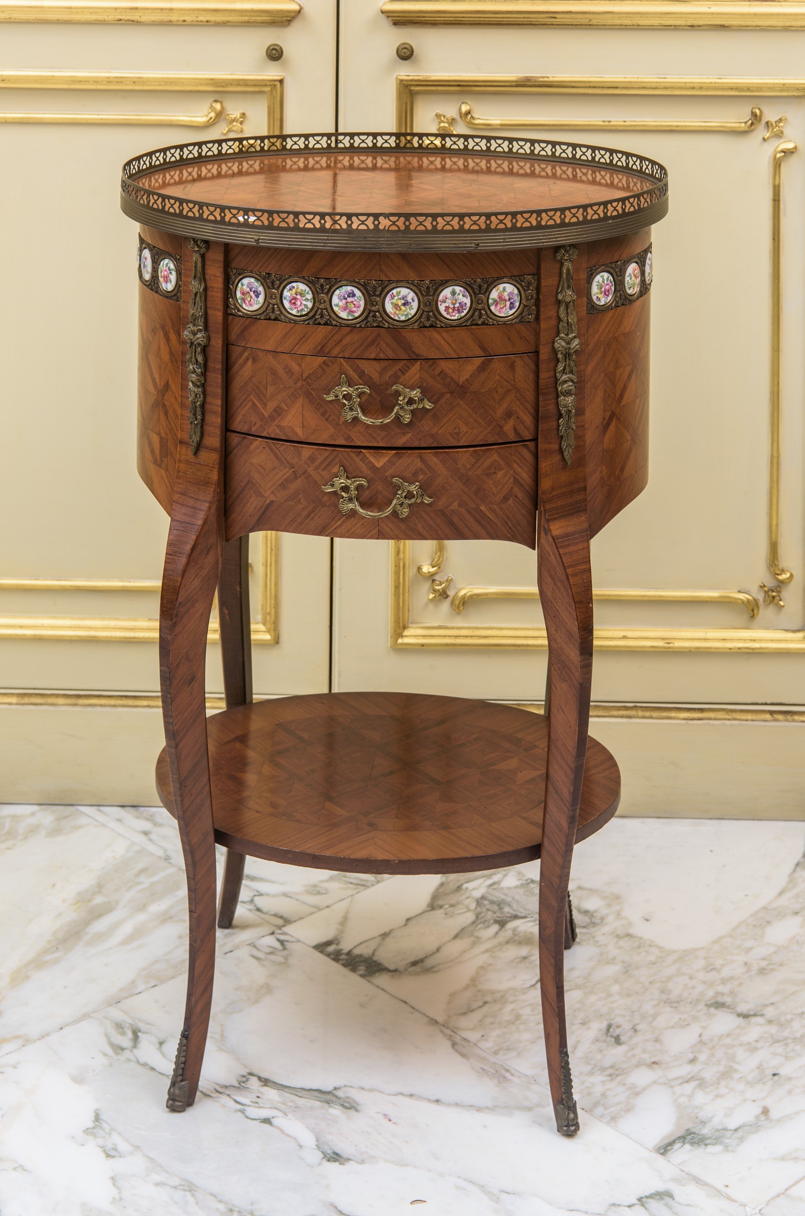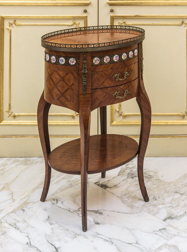 In legno bois de rose con intarsi geometrici a marqueterie. Fascia decorativa arricchita da una serie di medaglioni in porcellana dipinta a motivi floreali policromi, incastonati entro montature in bronzo dorato. Due cassetti frontali intarsiati, con maniglie e bocchette in bronzo cesellato.