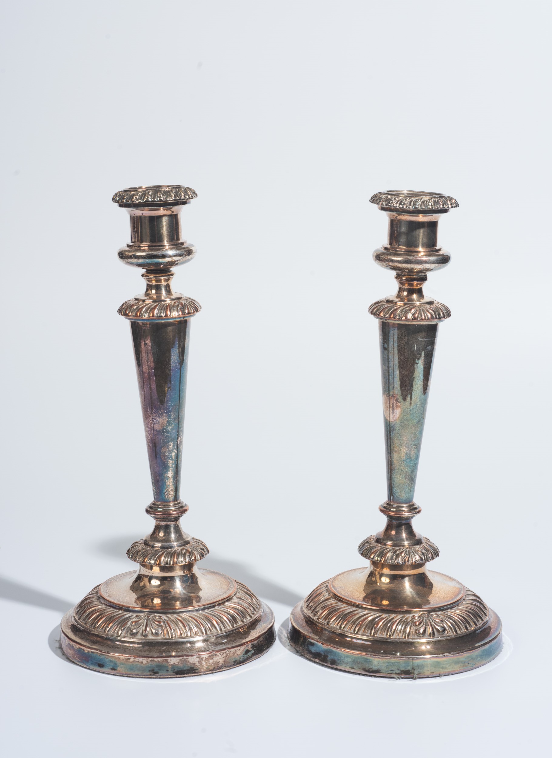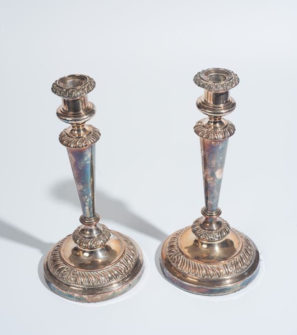 Coppia di candelabri baccellati in metallo argentato, XX secolo
