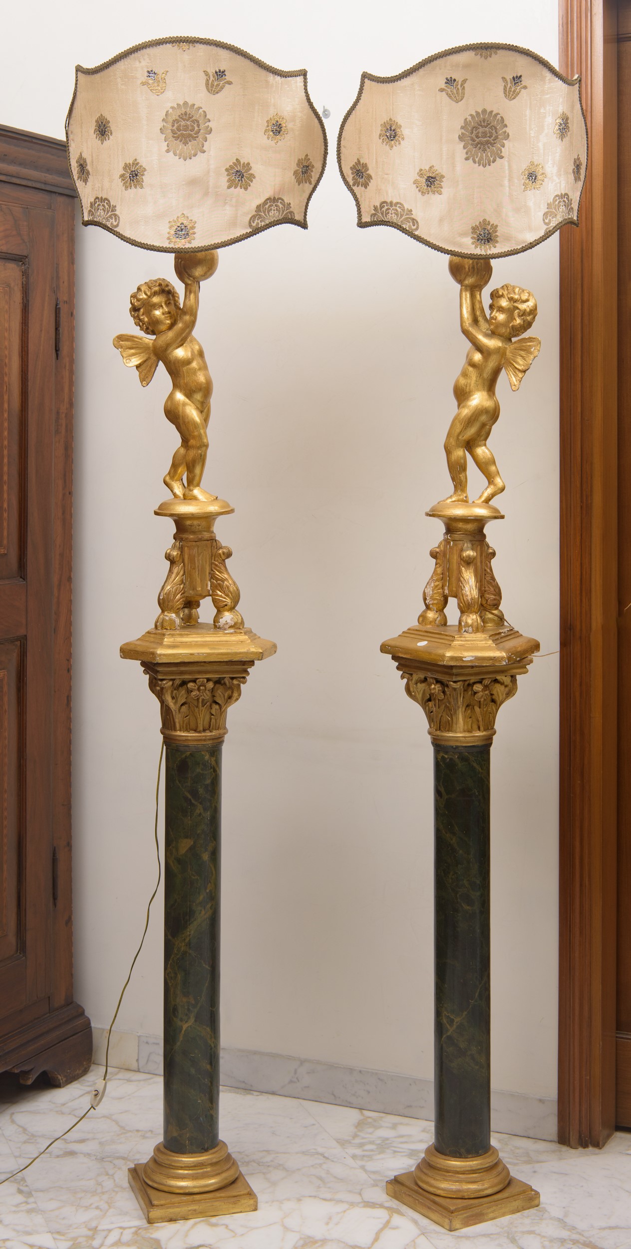 coppia di lampade da terra in legno intagliato e dorato, con figure di putti alati a tutto tondo sostenenti il corpo illuminante. Poggianti su colonne a finto marmo verde, con capitelli decorati a motivi vegetali. Basi sagomate e intagliate. Paralumi sagomati in tessuto.