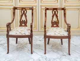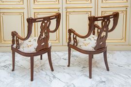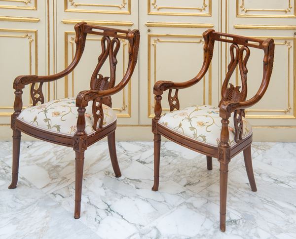 Coppia di poltroncine in legno, caratterizzate da schienale a giorno con motivo centrale a lira, tipico del gusto Impero. La struttura presenta linee sobrie e ben proporzionate, con braccioli curvati raccordati ai montanti anteriori e gambe rastremate di sezione cilindrica.