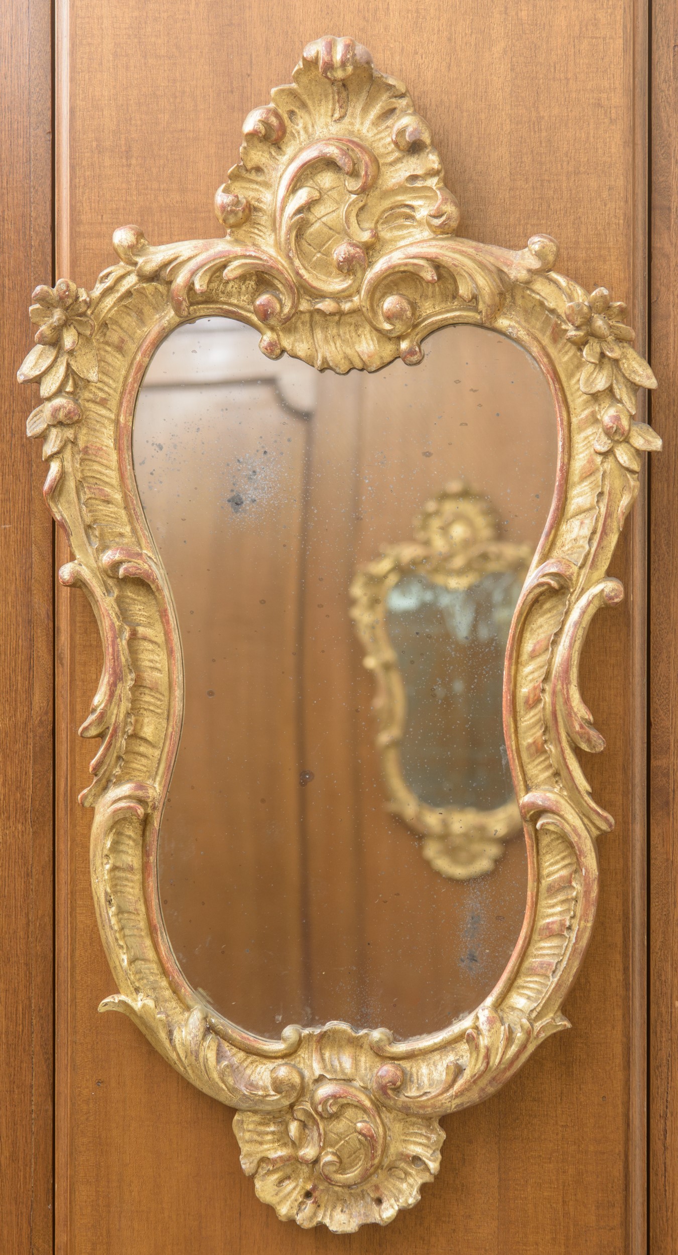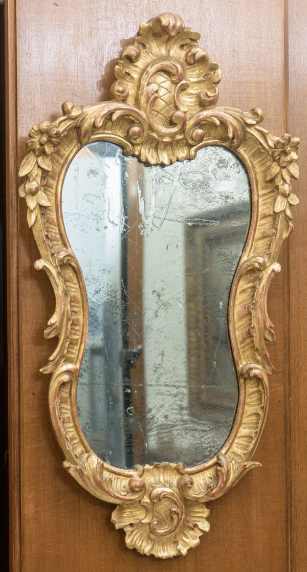 in legno intagliato e dorato, profilo mosso e ricca decorazione a volute, foglie e motivi floreali.