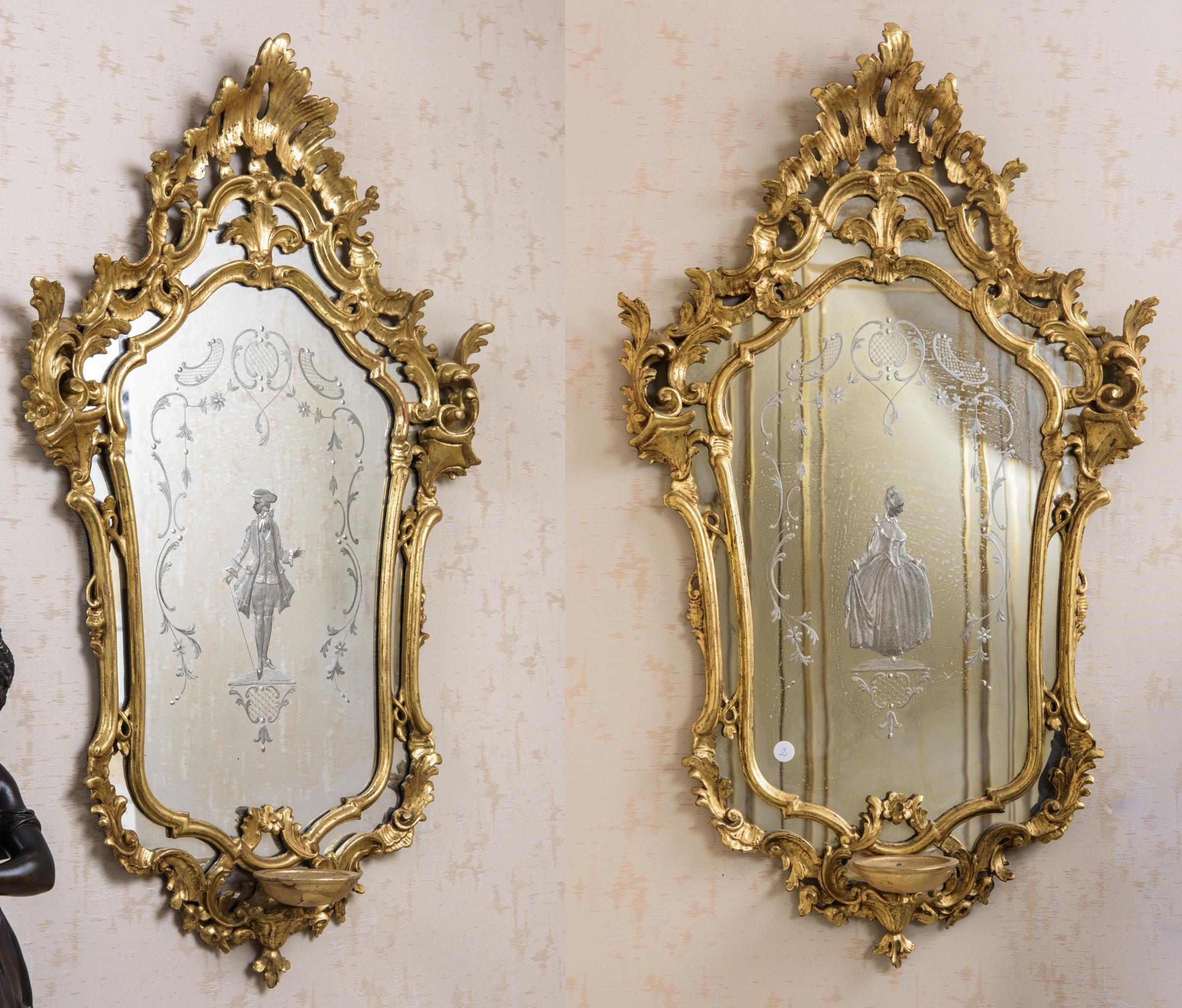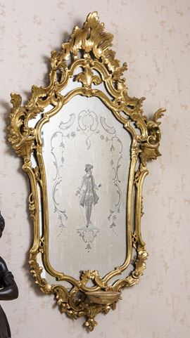 Specchi originali incisi con figure galanti di gusto settecentesco entro riserve ornamentali.