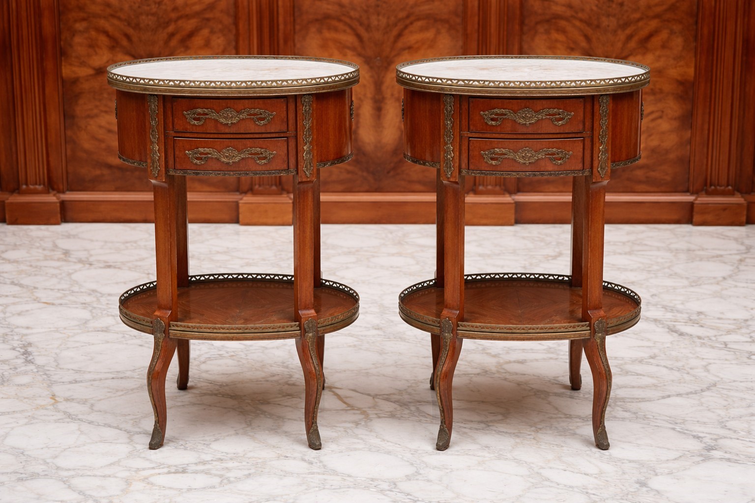 Coppia di tavolini rotondi da salotto, realizzati in legno impiallacciato d'ispirazione Luigi XVI. I piani circolari, profilati da una raffinata galleria traforata in metallo, sono impreziositi da inserti in marmo chiaro.