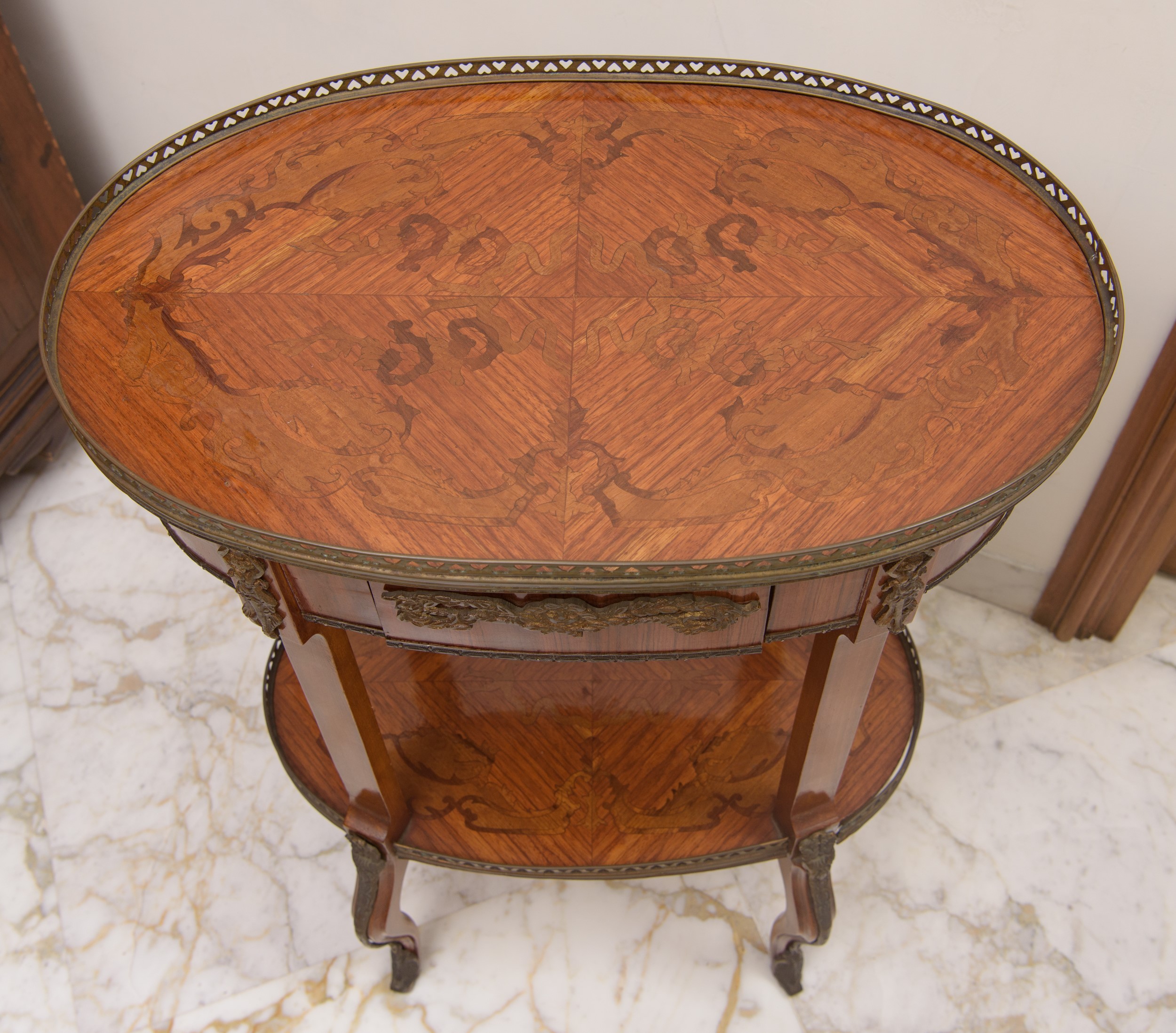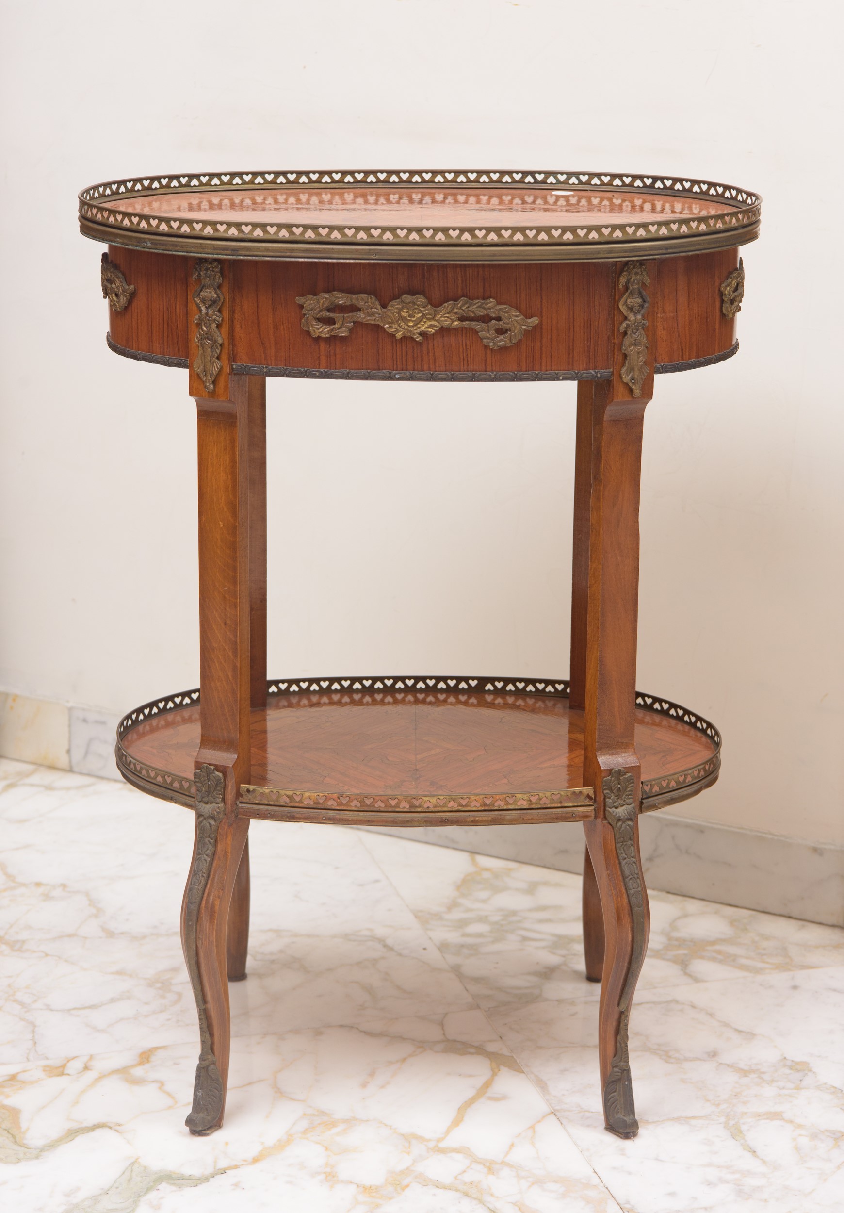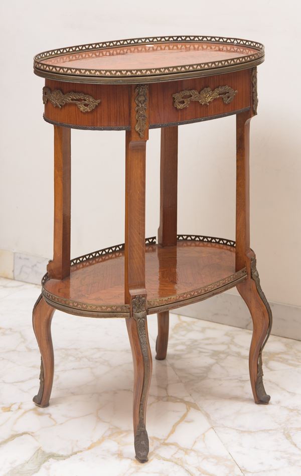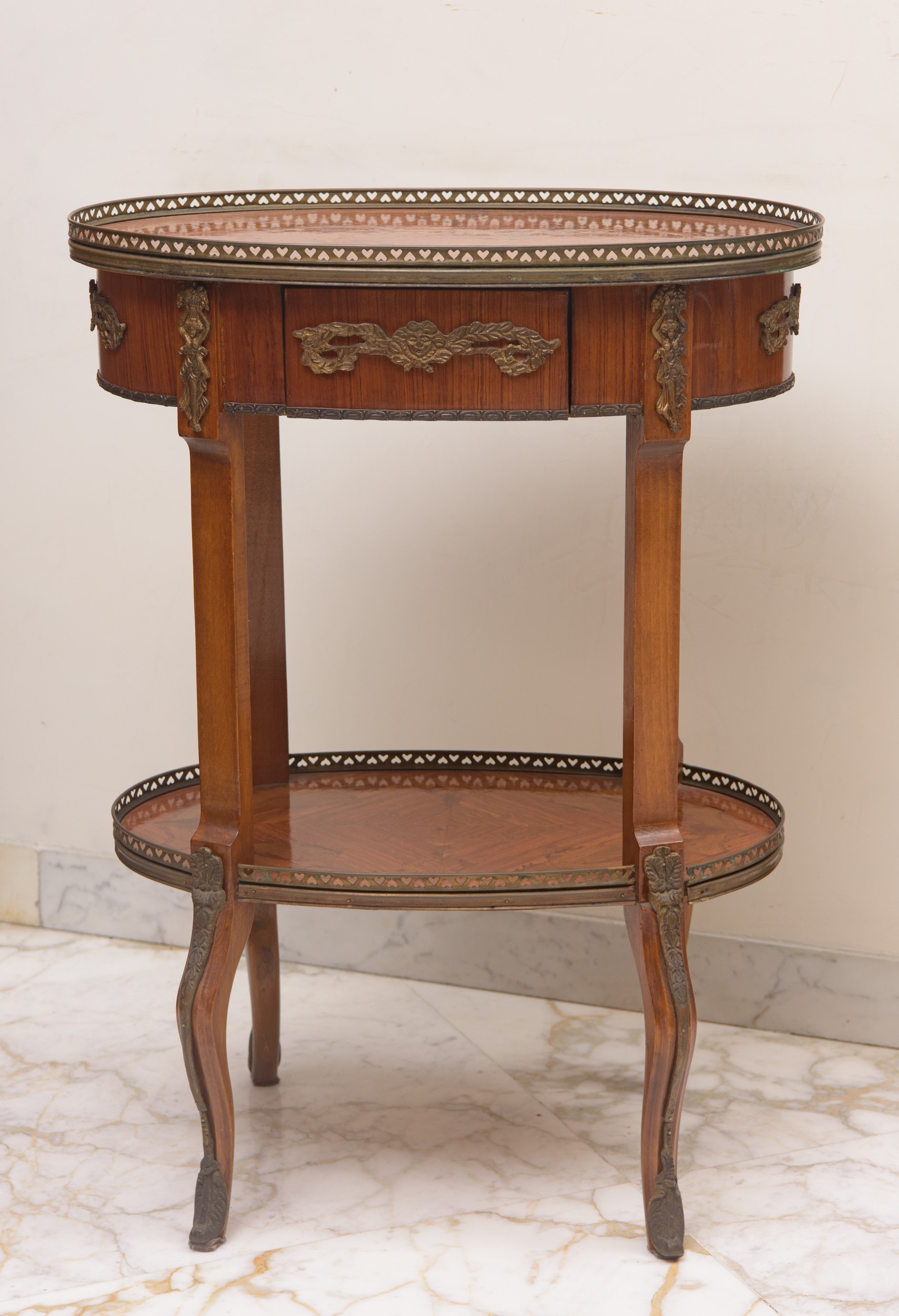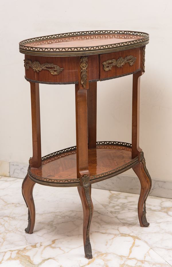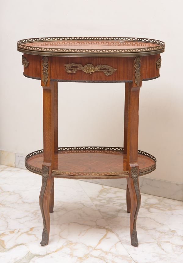 La fascia sottopiano accoglie un piccolo cassetto frontale, arricchito da maniglie e applicazioni in bronzo dorato finemente lavorato, mentre sottili montanti raccordano il piano superiore al ripiano inferiore, anch’esso circolare e delimitato da galleria traforata.