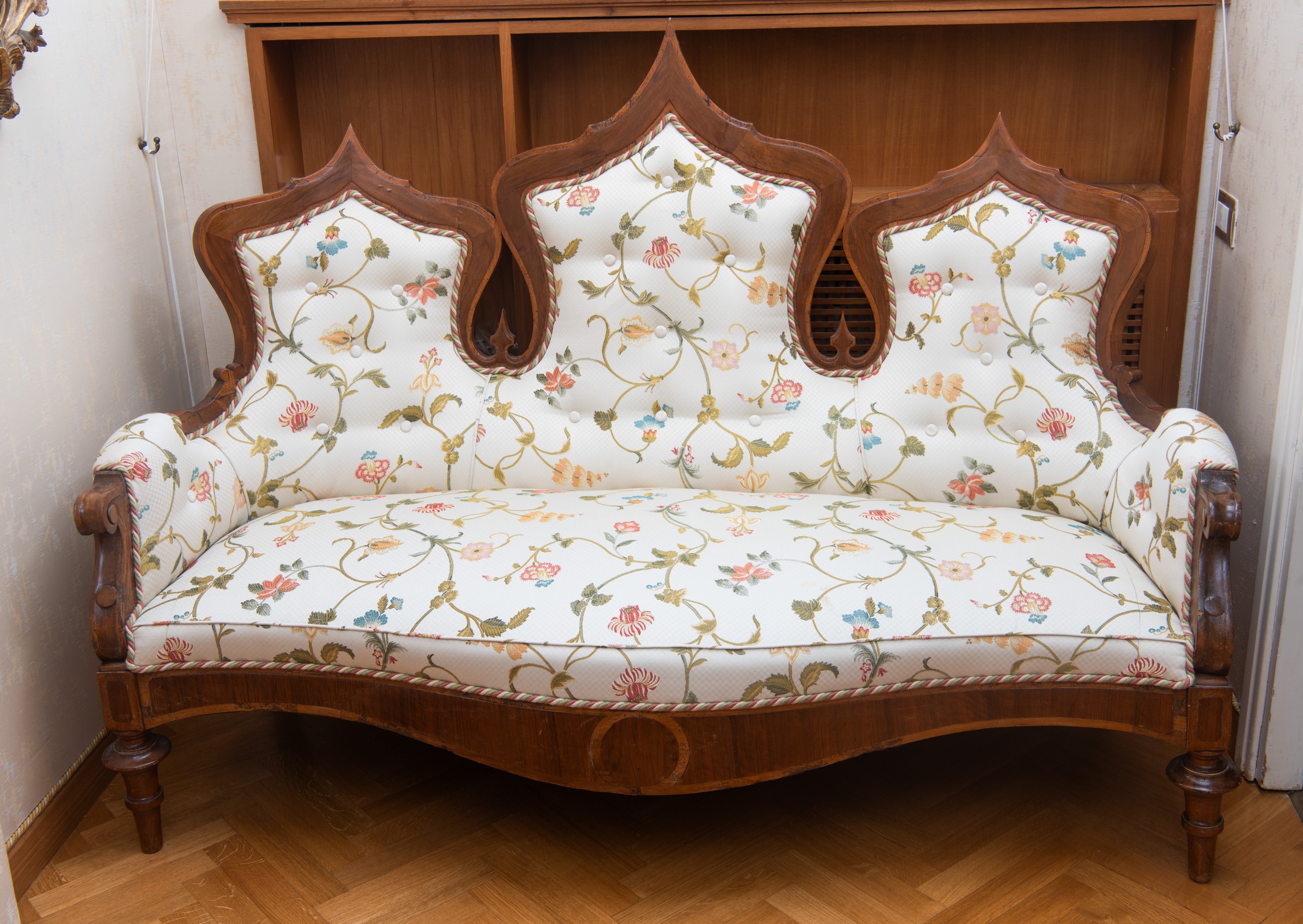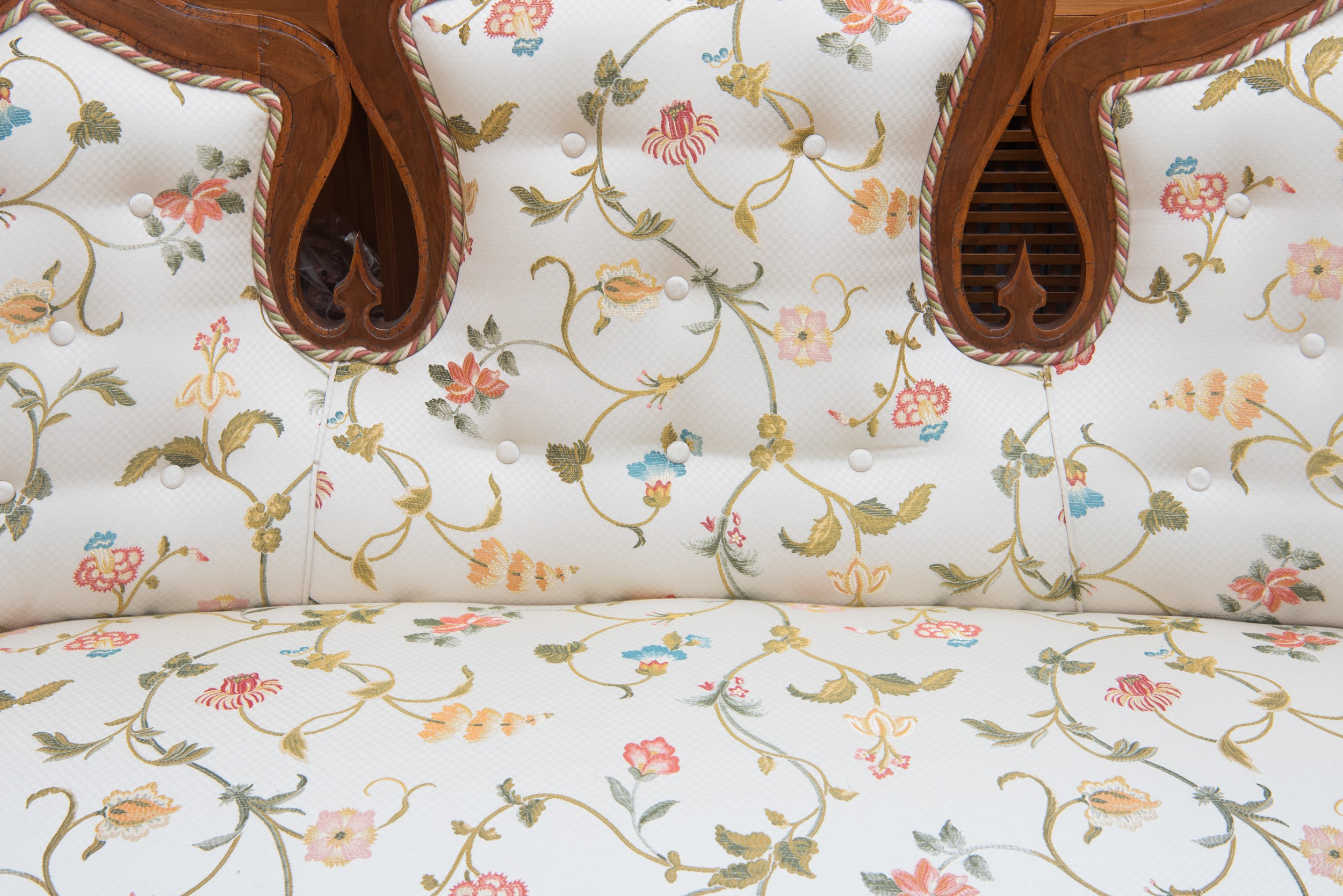 La fascia frontale è leggermente ondulata ed è arricchita da una riserva centrale. Il divano è stato rivestito in epoca recente con tessuto a motivo floreale.