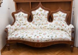 Elegante divano a due posti in legno di noce, schienale sagomato a tre cuspidi. La struttura presenta linee mosse e armoniose, con braccioli terminanti a ricciolo e gambe anteriori tornite.