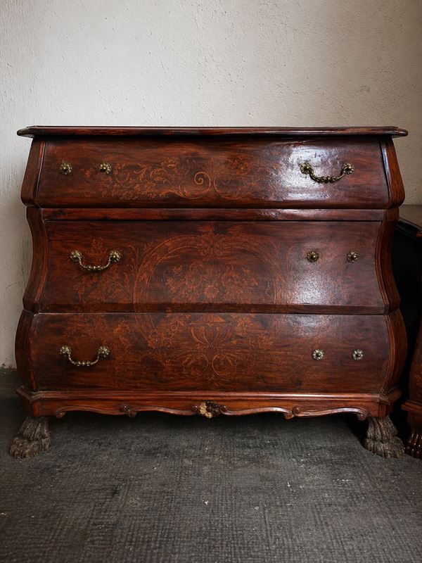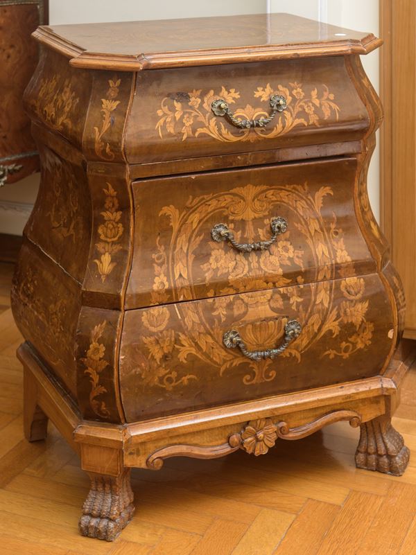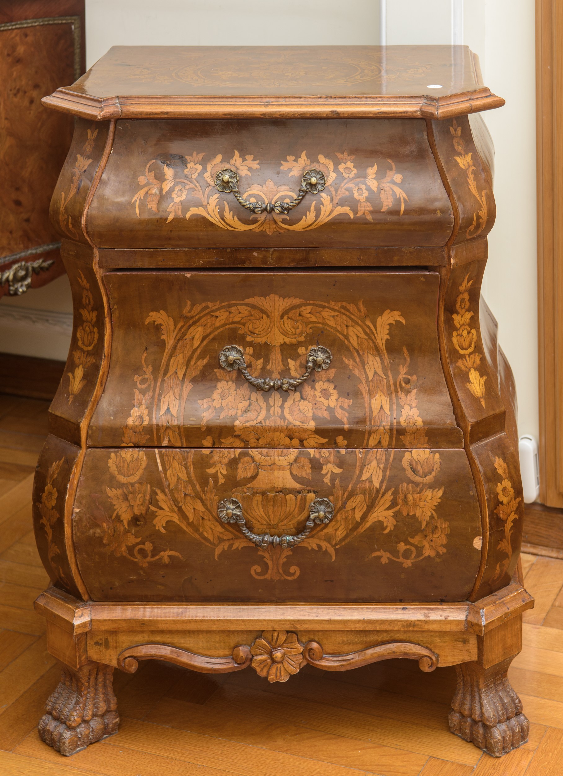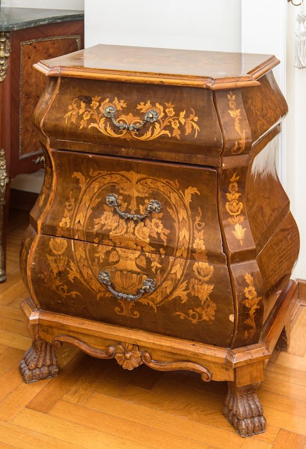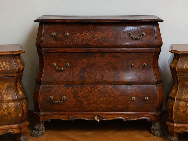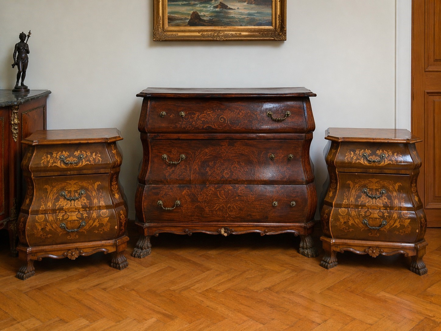 Realizzati in legno massello con ricca impiallacciatura e intarsio floreale, presentano forme mosse e bombate tipiche del gusto rocaille. Il comò è a tre cassetti con fronte fortemente sagomato e decorato da raffinati motivi fitomorfi intarsiati disposti in composizione simmetrica; i comodini, anch’essi mossi, riprendono lo stesso impianto decorativo con cassetti e superfici intarsiate coordinate. Le gambe sono cabriole, terminate con piedi scolpiti, mentre il grembiule è sagomato e arricchito da piccoli elementi ornamentali. Le maniglie e le bocchette sono in metallo.