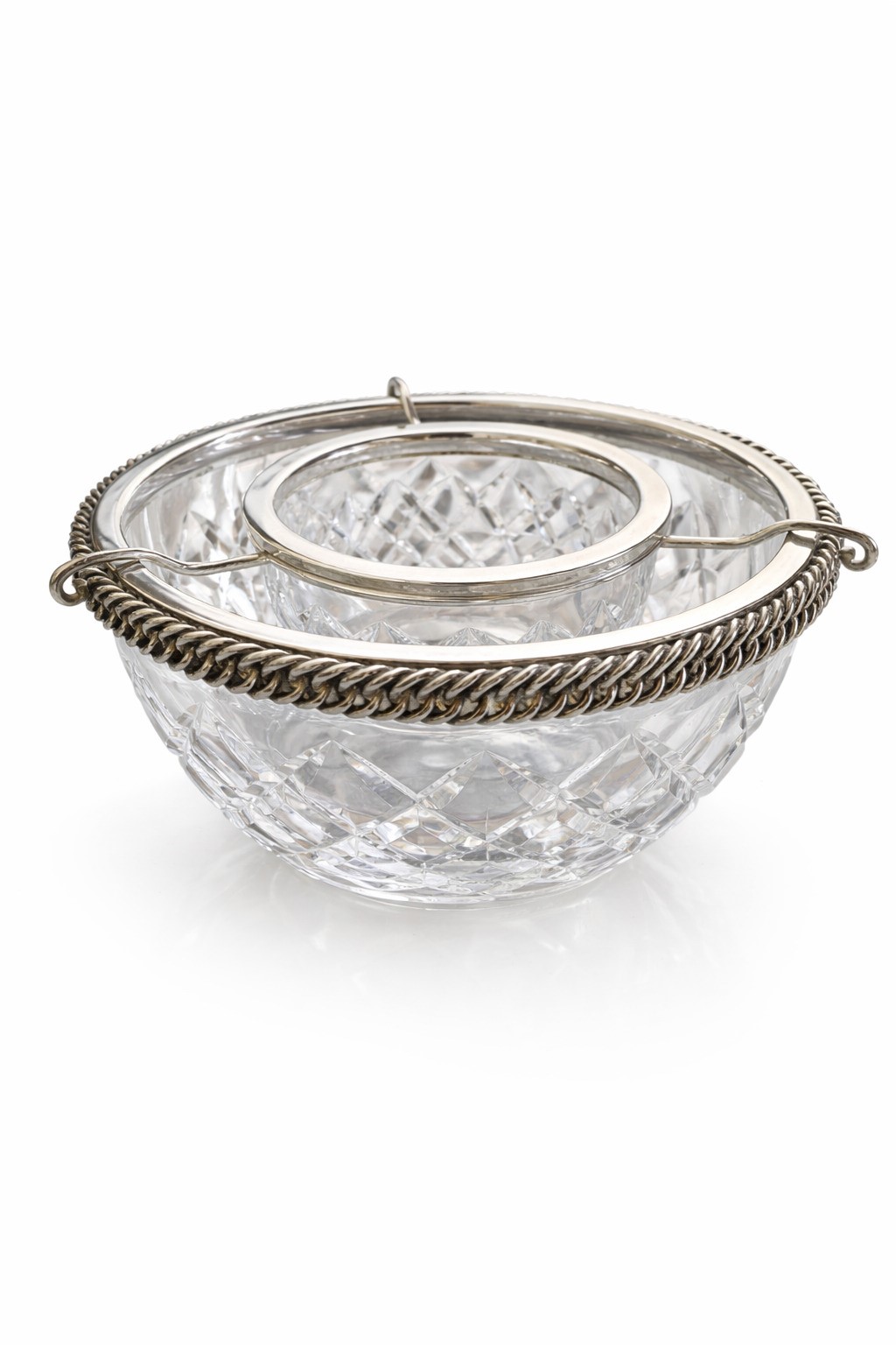 Coppa emisferica in cristallo lavorato a taglio geometrico, inserita in montatura in metallo argentato con bordo decorato a motivo intrecciato e anse laterali sagomate. All’interno è presente elemento circolare sospeso, destinato ad accogliere contenitore interno o ghiaccio, secondo la tipologia tradizionale del servizio da caviale.