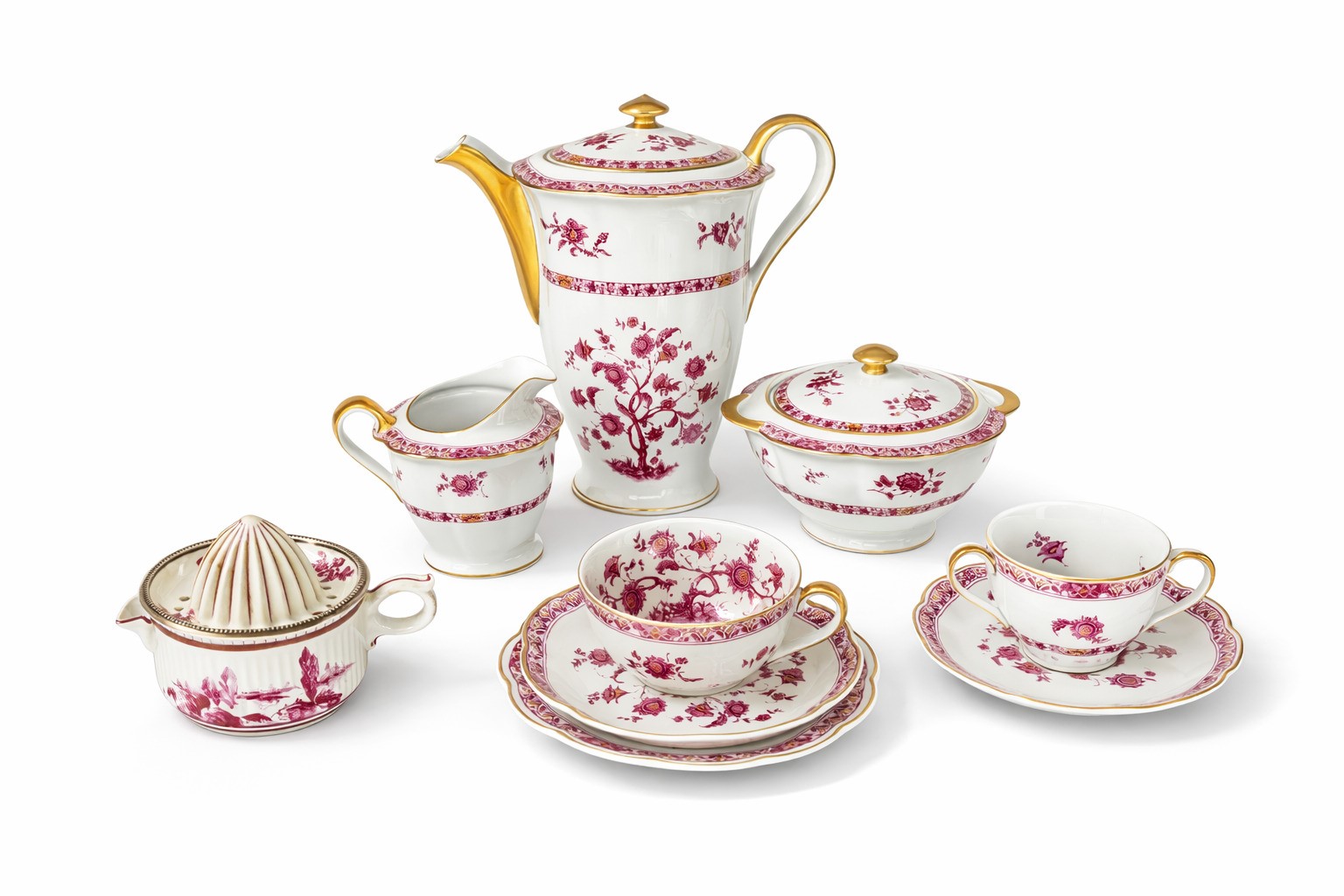 Servizio composto da: 9 piattini da dessert, 8 piattini da tè, 5 piattini da caffé, 1 spremi limone, 1 teiera, 1 lattiera, 1 zuccheriera.