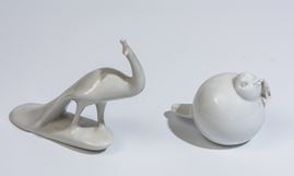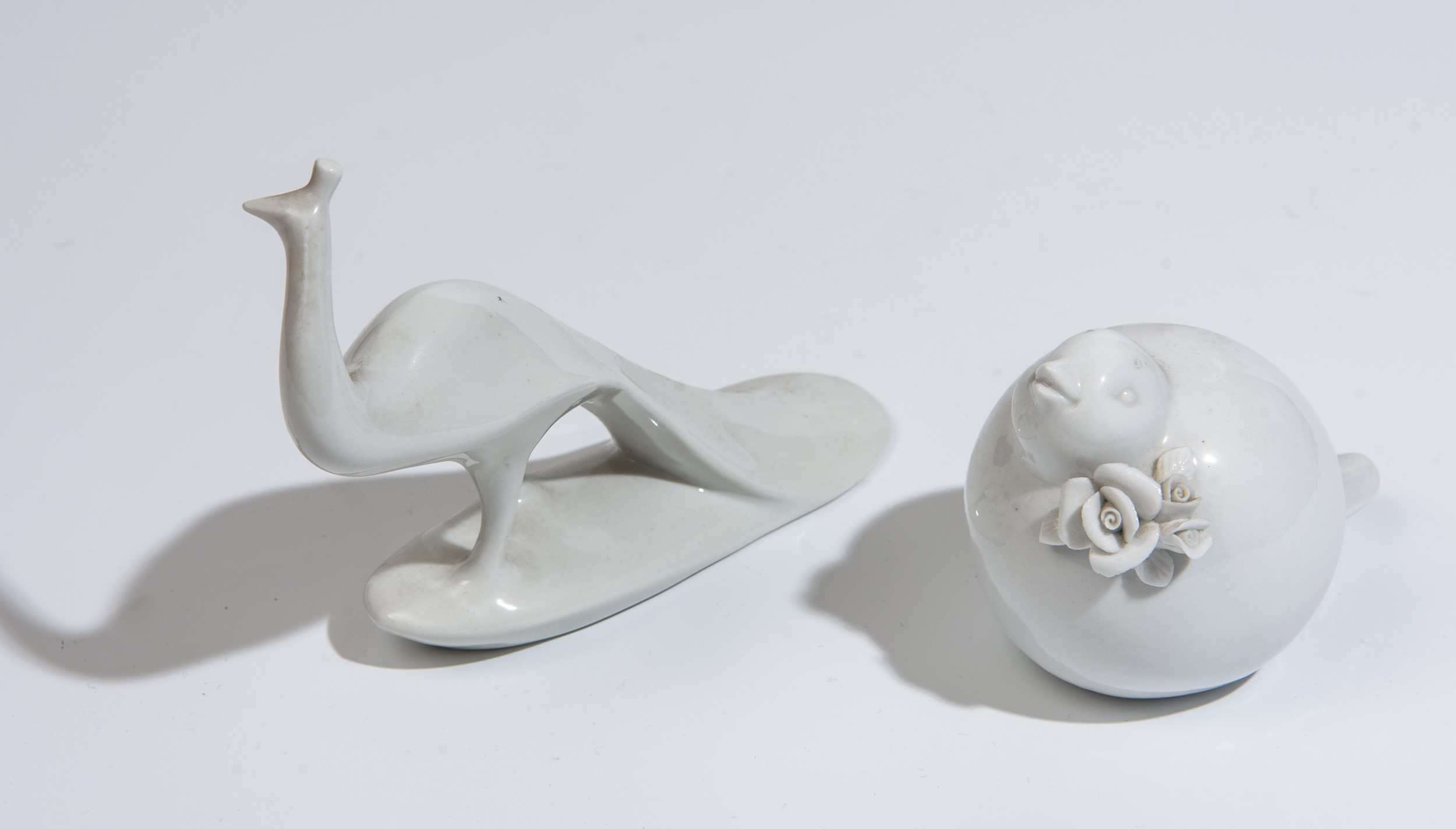 Tra cui: un pavone (manifattura Capodimonte)(12 x 18 cm), un volatile (8 x 9 cm) e due candelieri Royal Copenhagen (H 11 cm).