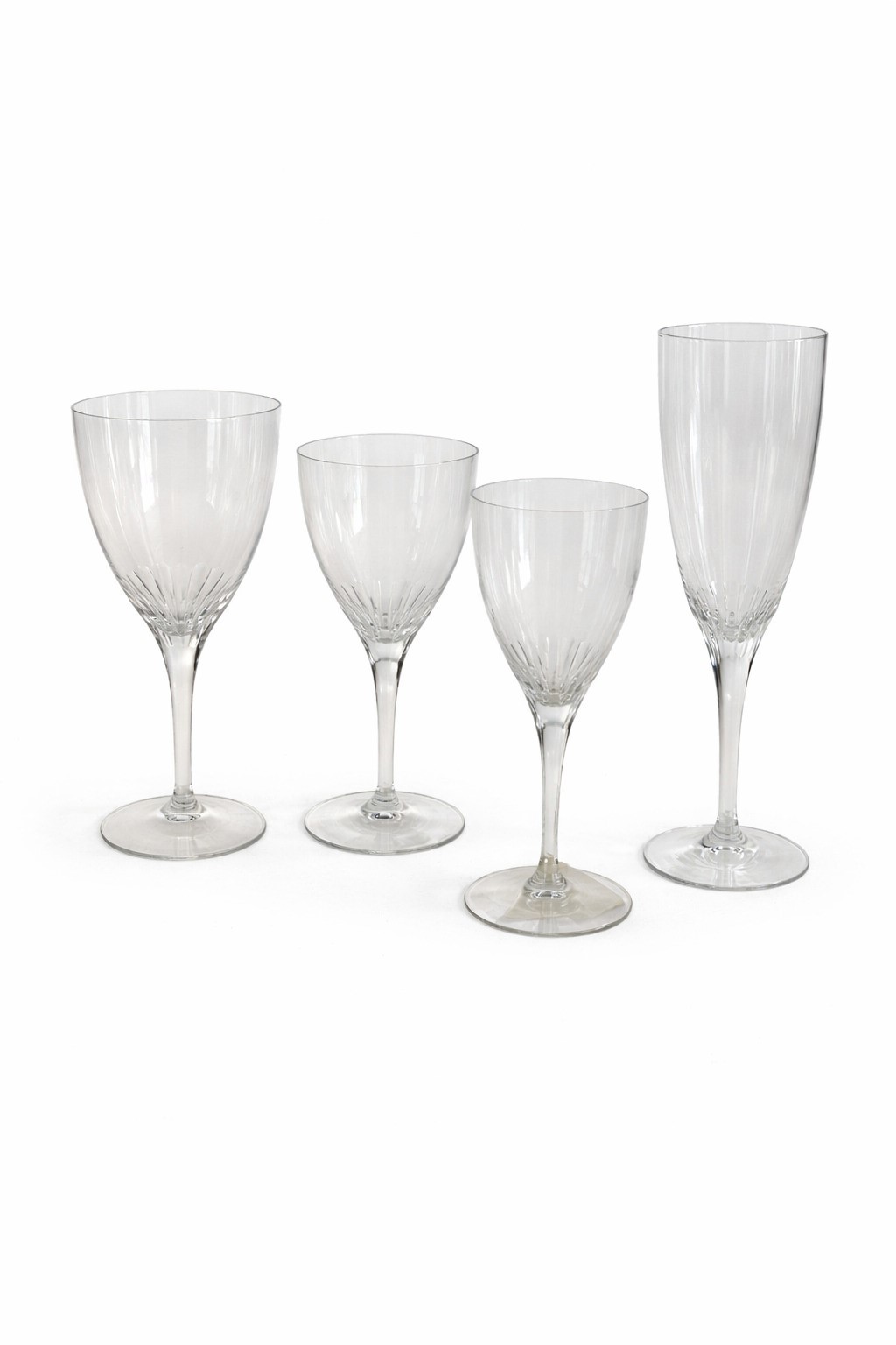 Il lotto comprende 12 bicchieri da acqua, 8 bicchieri da vino rosso, 7 bicchieri da vino bianco e 8 flute. Gli esemplari presentano coppa liscia leggermente svasata con decorazione alla base a sottili scanalature radiali, sostenuta da gambo slanciato e base circolare. Dimensioni :