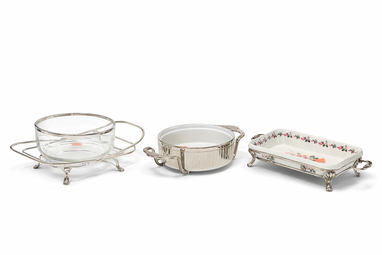 In metallo argentato, ceramica e vetro. Composto da due teglie con sostegno ( 28 x 18 cm), un contenitore ((d. 24 x 9 cm), due contenitori con bordo (d. 17 e d. 23 cm - h. 10 cm), due sostegni (1 regolabile) (l. 43 cm).