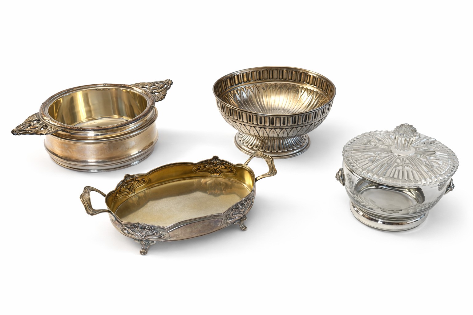 Lotto di oggetti da tavola in metallo argentato e vetri, XX secolo