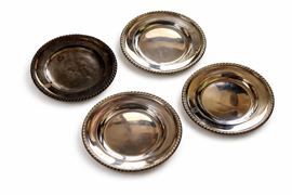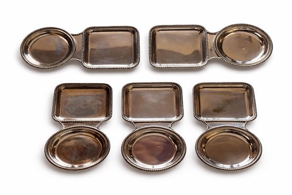 Composto da: 12 sottopiatti sheffield con stemma (d. 20 cm), 12 sottopiatti silverplated (d. 30 cm), 5 porta bicchieri da aperitivo (15 x 7 cm).