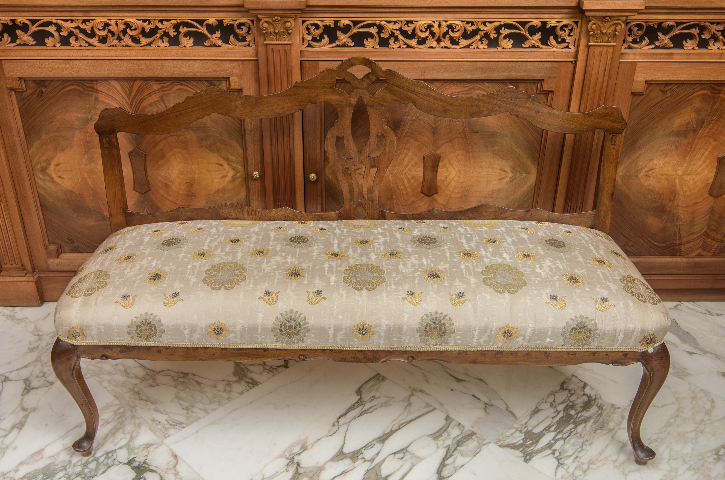 in legno con struttura sagomata e intagliata, schienale mistilineo con elemento centrale traforato a motivo curvilineo e gambe mosse di gusto rocaille. Seduta ampia imbottita e rivestita in tessuto operato chiaro con decorazioni floreali nei toni dell’oro e del tortora.