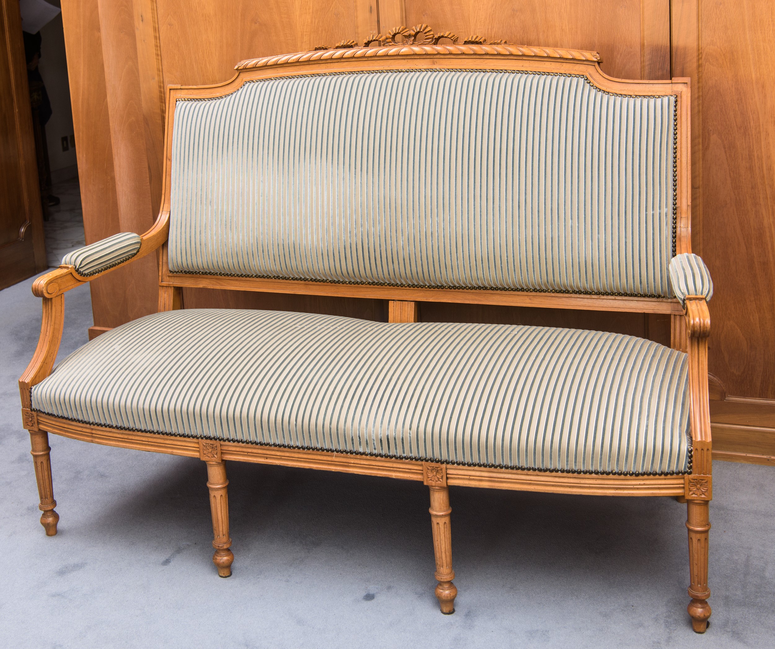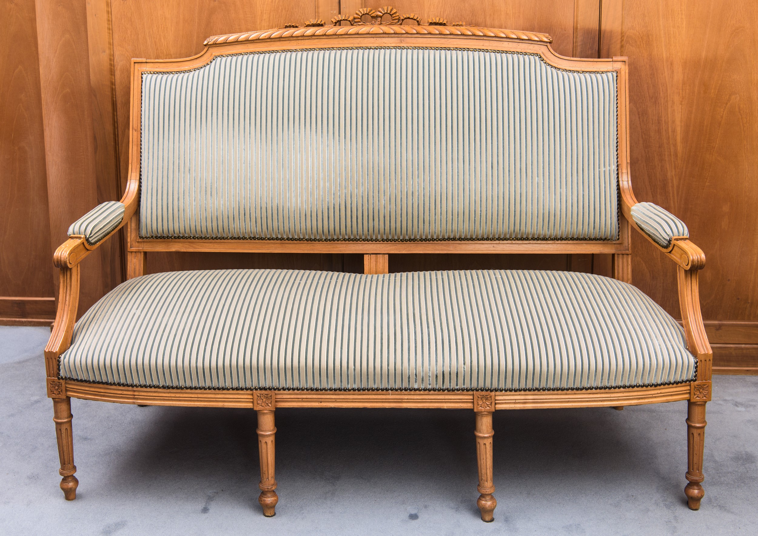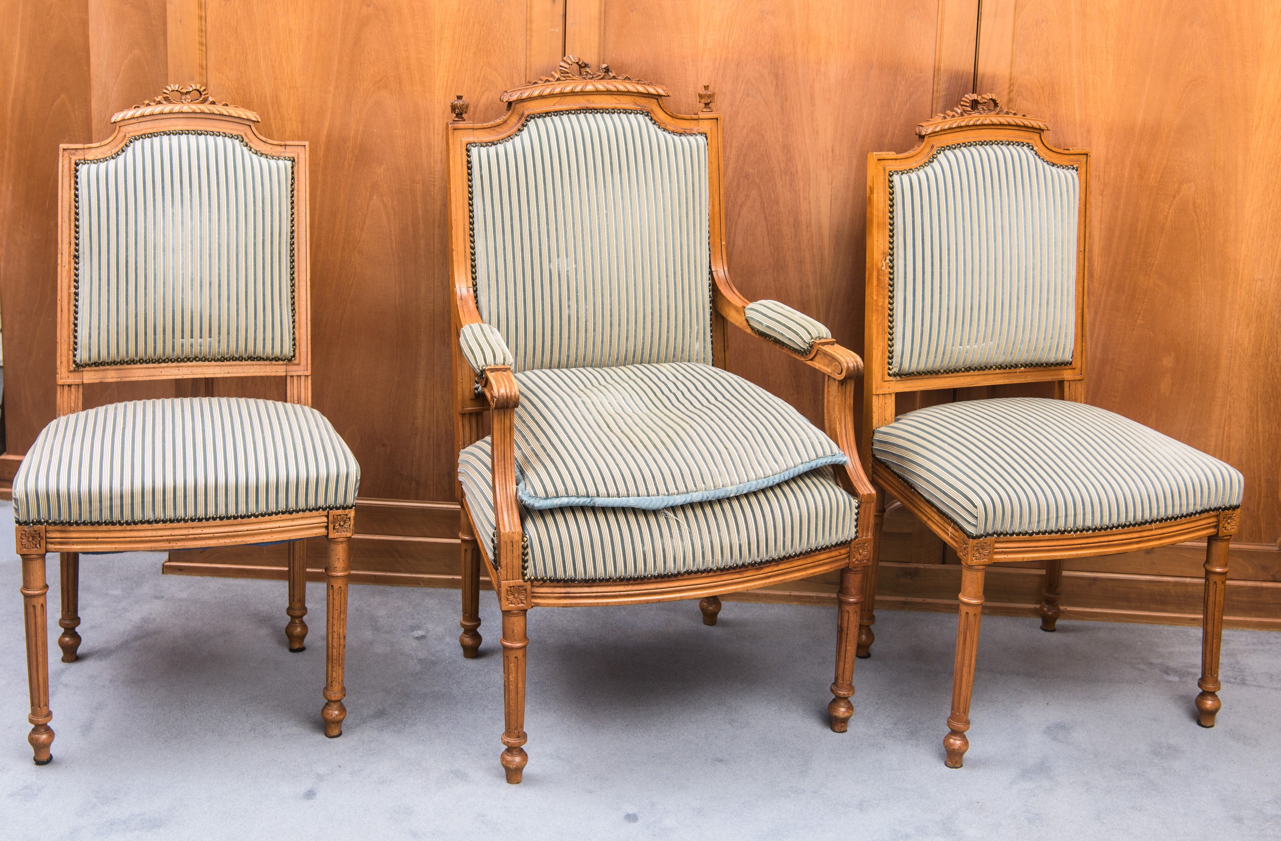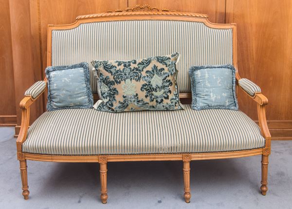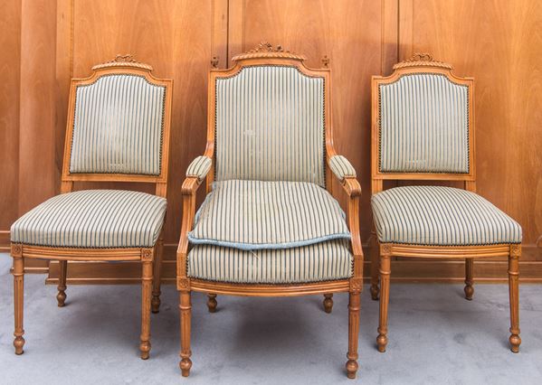 Salotto composto da divano, due sedie e due poltrone in stile Luigi XVI, Francia, inizio XX secolo