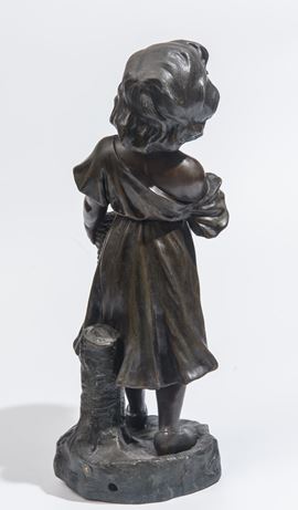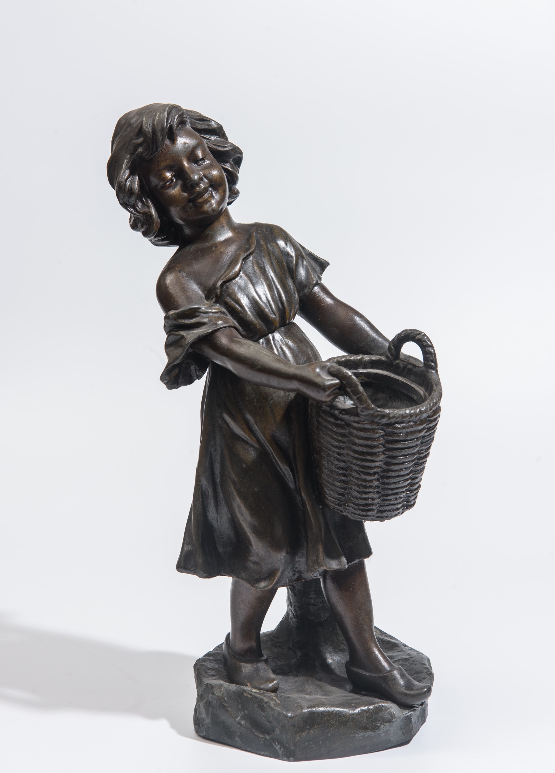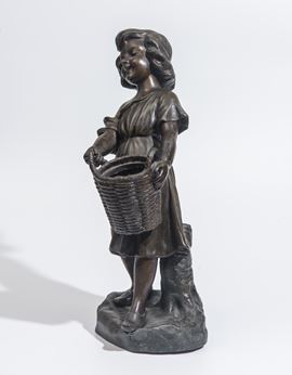 Scultura in antimonio raffigurante fanciulla con cesta, XX secolo