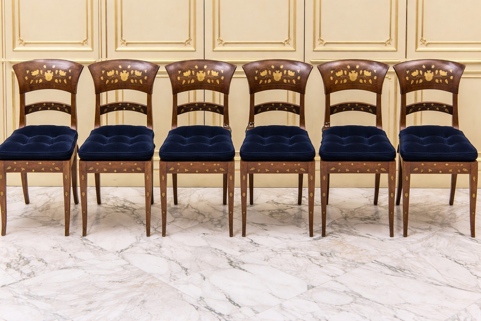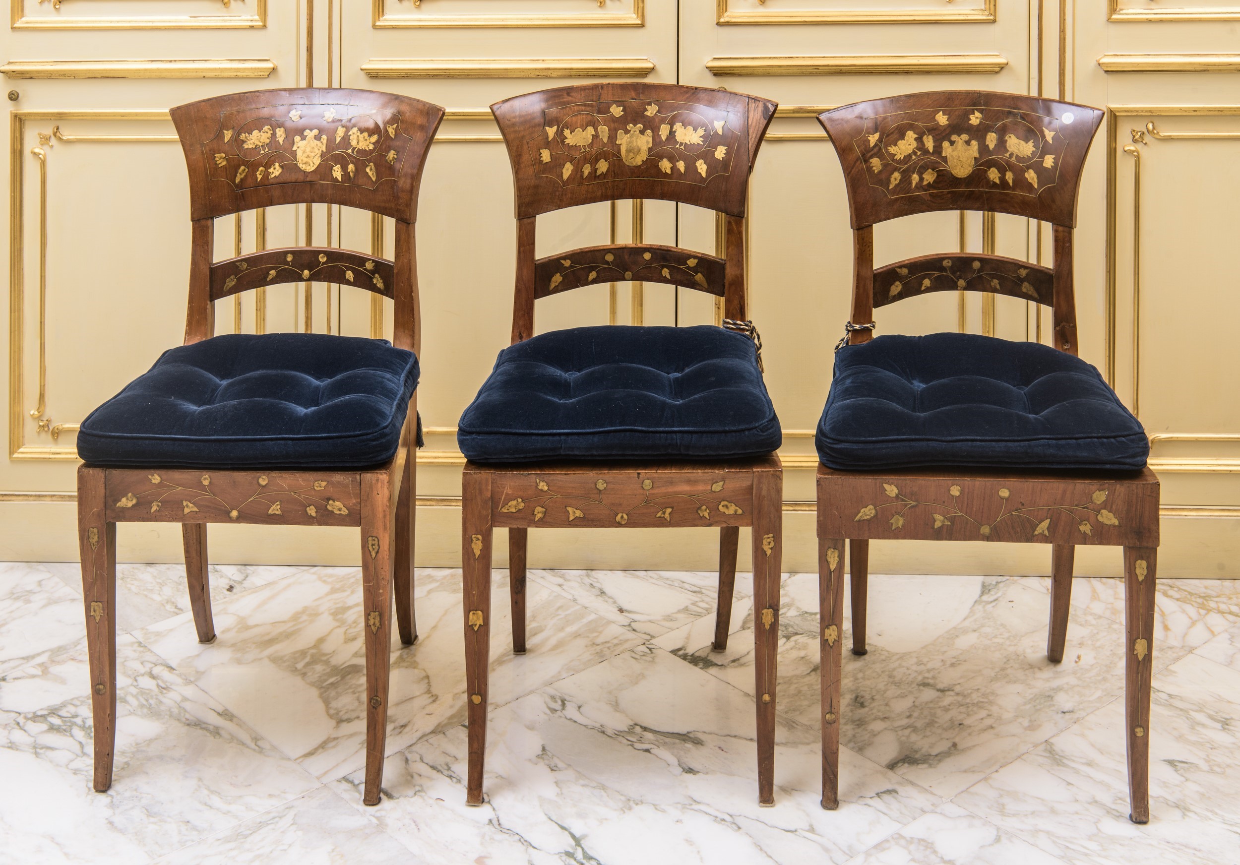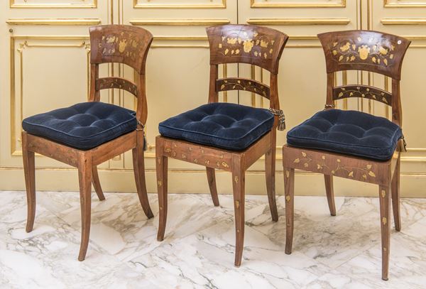 Schienale leggermente arcuato, filettature e decori intarsiati a motivi classici e floreali, gambe tronco-piramidali. Seduta imbottita rivestita in velluto blu. Con intarsi in ottone. Una con Difetti al canneté.