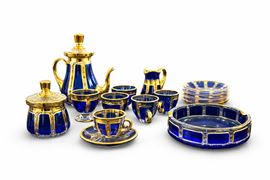 Composto da: 1 caffettiera, 6 tazzine da caffè, 6 piattini, 1 lattiera, 1 zuccheriera, 1 porta bon-bon.