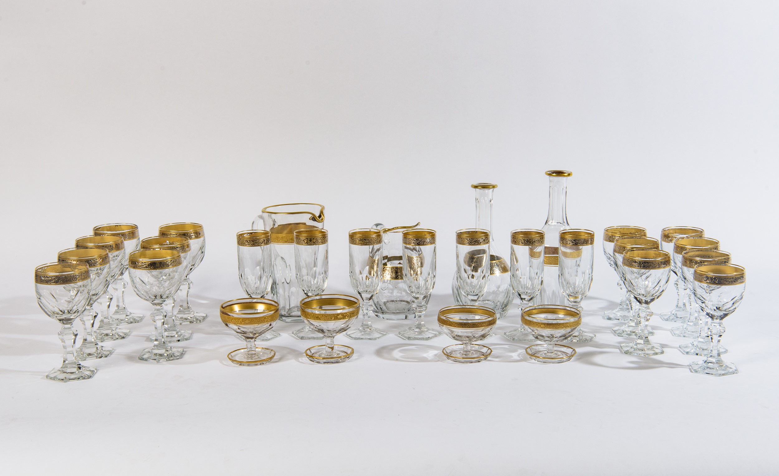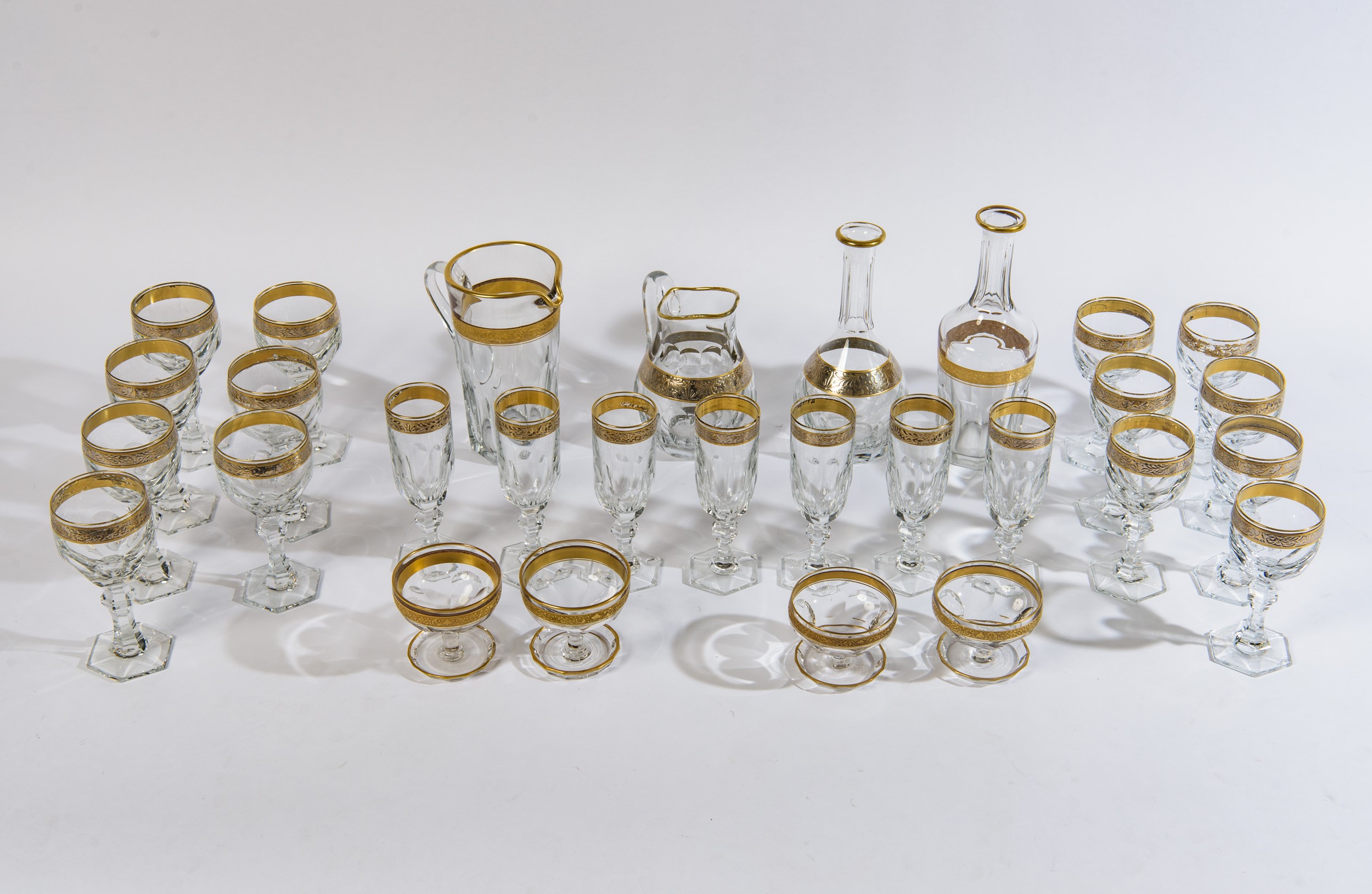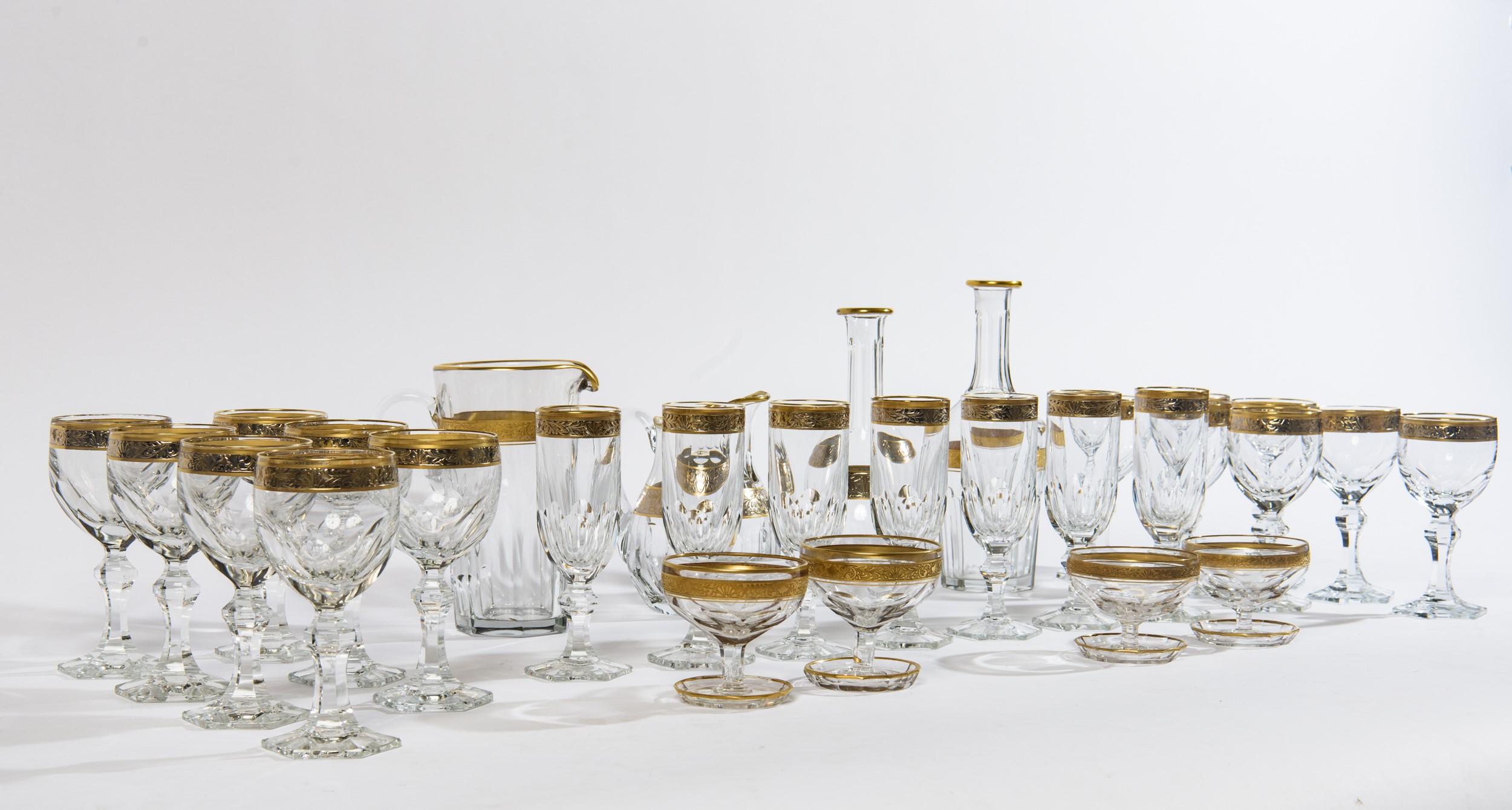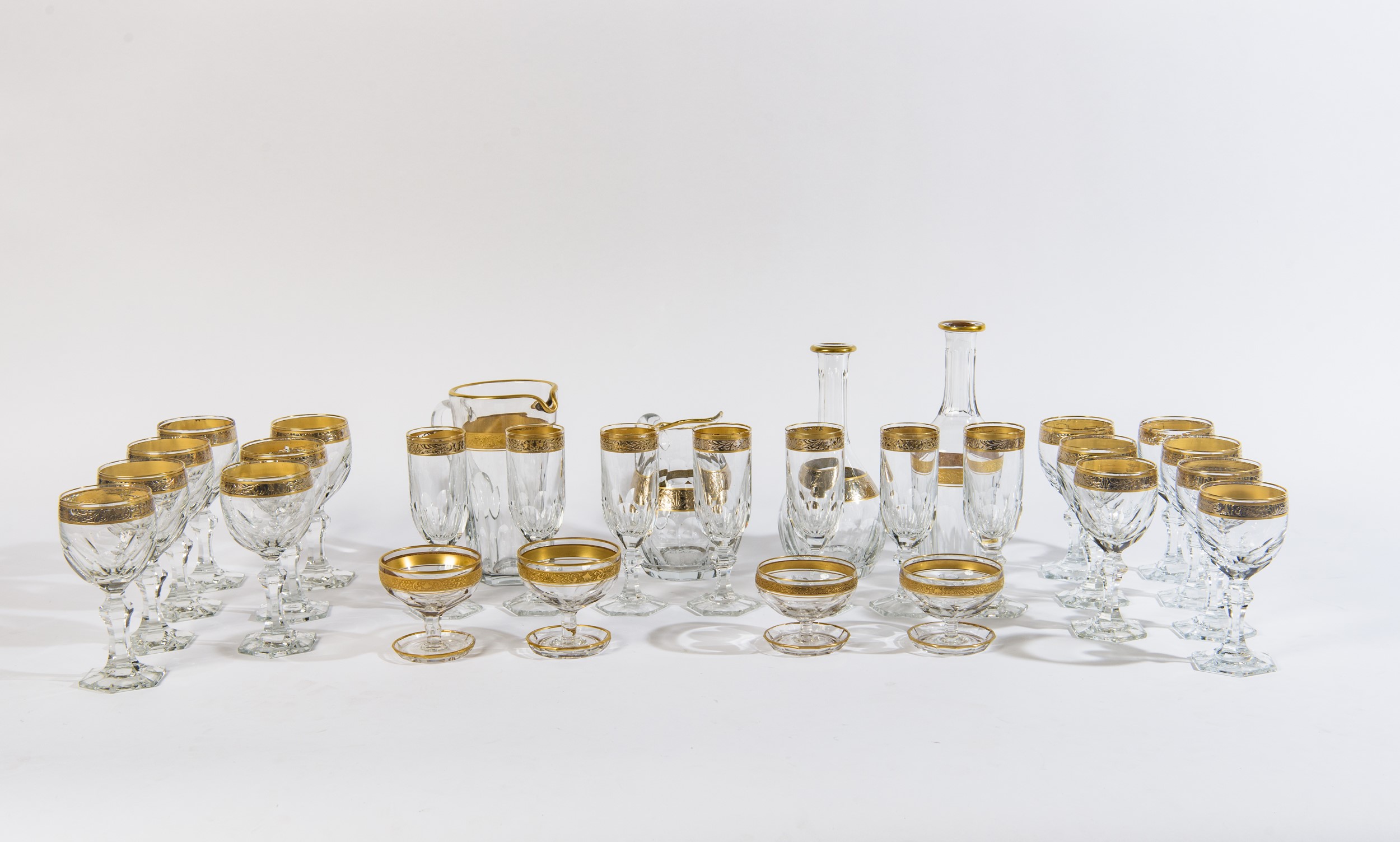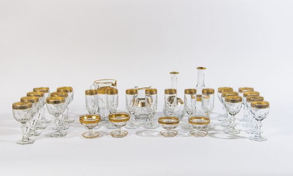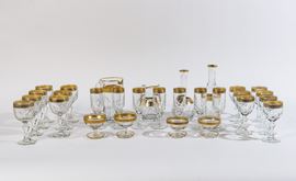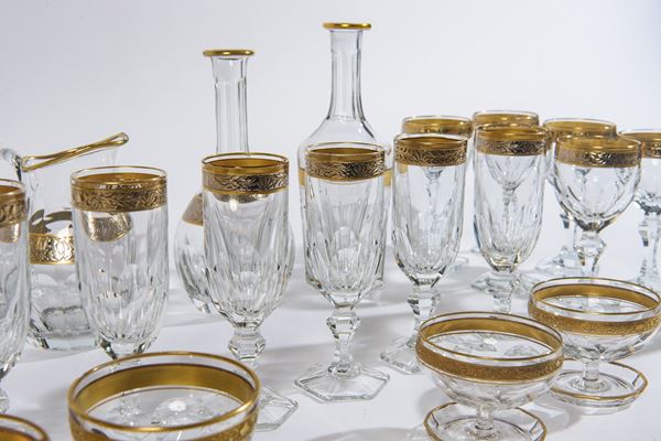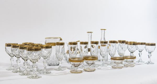 Composto da: 7 bicchieri da vino rosso, 7 bicchieri da vino bianco, 7 flutes, 2 coppe da macedonia, 2 coppe da gelato (di cui 1 scheggiata), 4 caraffe